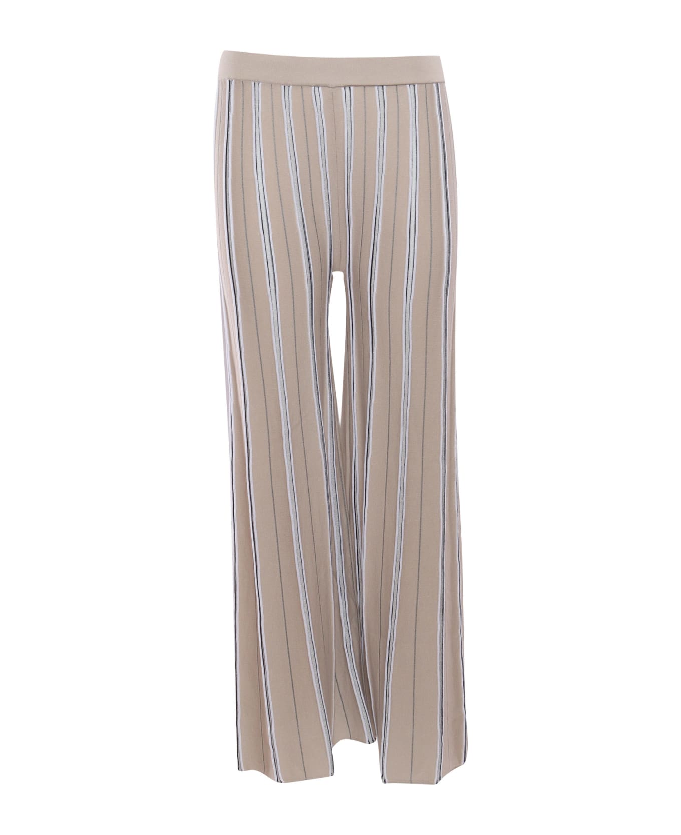 Beige jacquard palazzo trousers with contrasting stripe pattern, elastic waistband, lurex detail.