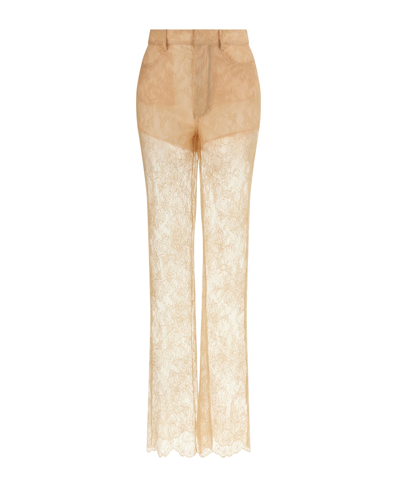 Lace trousers, flared leg, zipper, hook and front button closure, tone-on-tone inner culottes. Composition: 100% polyamide