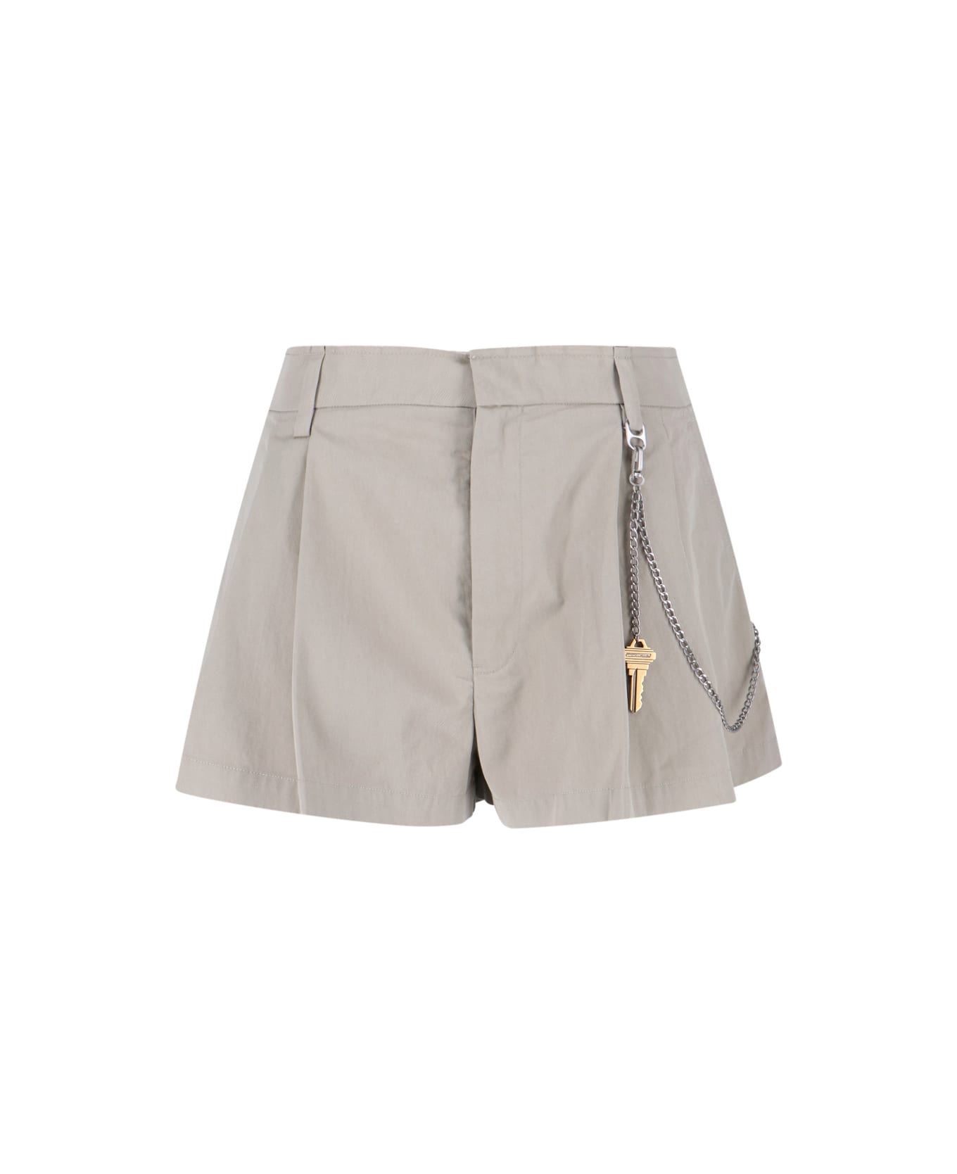Alexander Wang shorts in beige cotton blend, mid waist, belt loops, hook and zip closure, front pin tucks, silver metal chain on the side, logo key charm detail, two side pockets, two back welt pockets, straight hem.