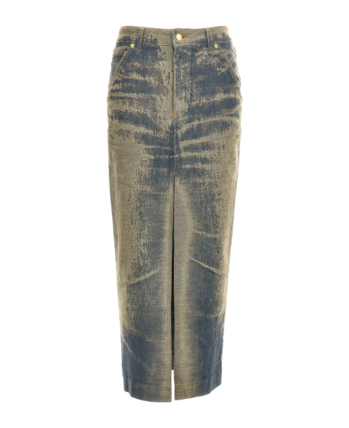 'Erika' vintage effect cotton denim blend skirt, zip and button closure, five pockets, maxi front and back split. Composition: 63% cotton 35% polyester 2% elastane
