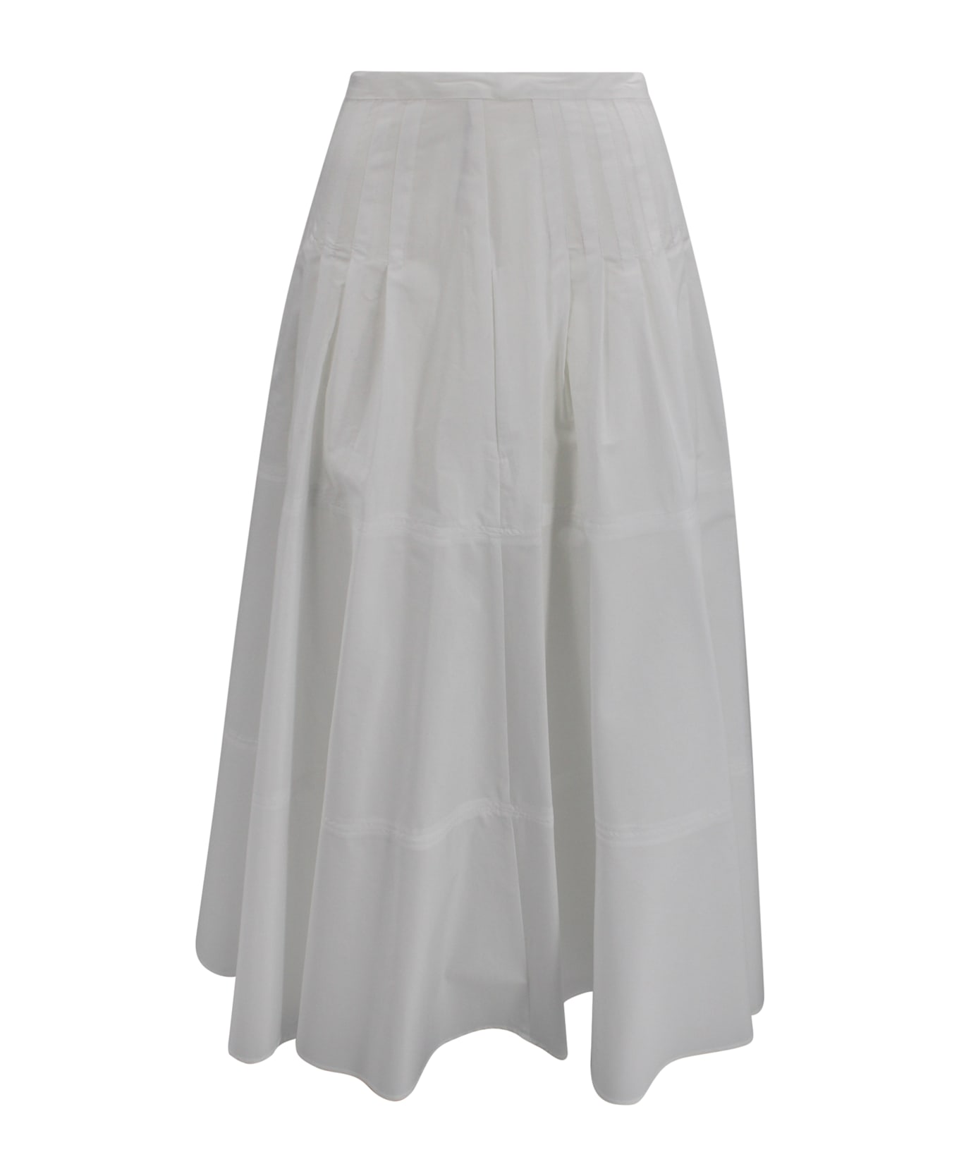 Long skirt crafted from pure cotton poplin, featuring a corset-inspired waist detail and soft pleats that add movement to the silhouette. Designed with a wide flared cut, side zip fastening, and side seam pockets. The look is enhanced by decorative horizontal panels.