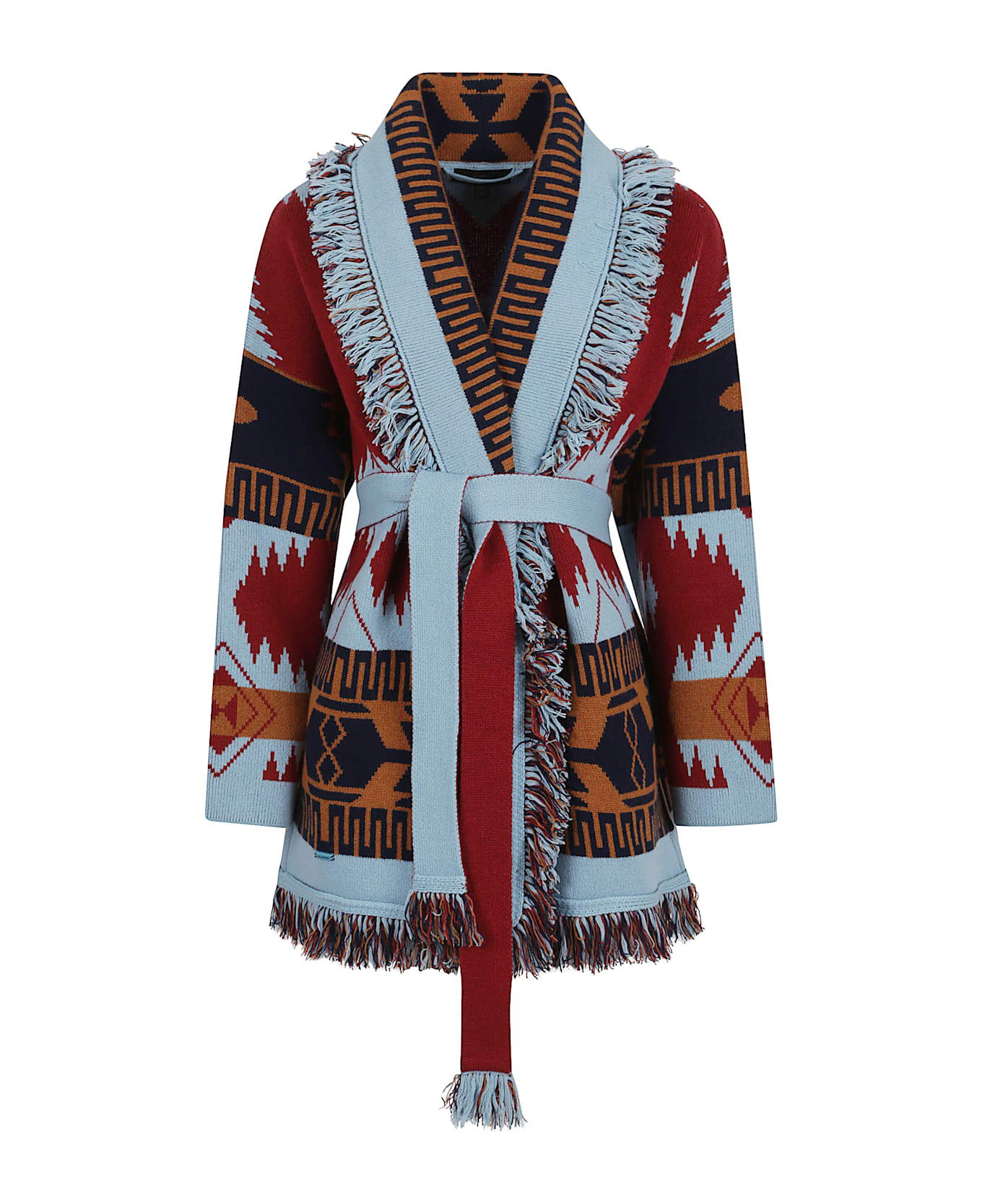 Icon Jacquard Cardigan in 100% cashmere by ALANUI. Icon fit; two-tone belt and multicolored fringe edges. Features double jacquard knit.