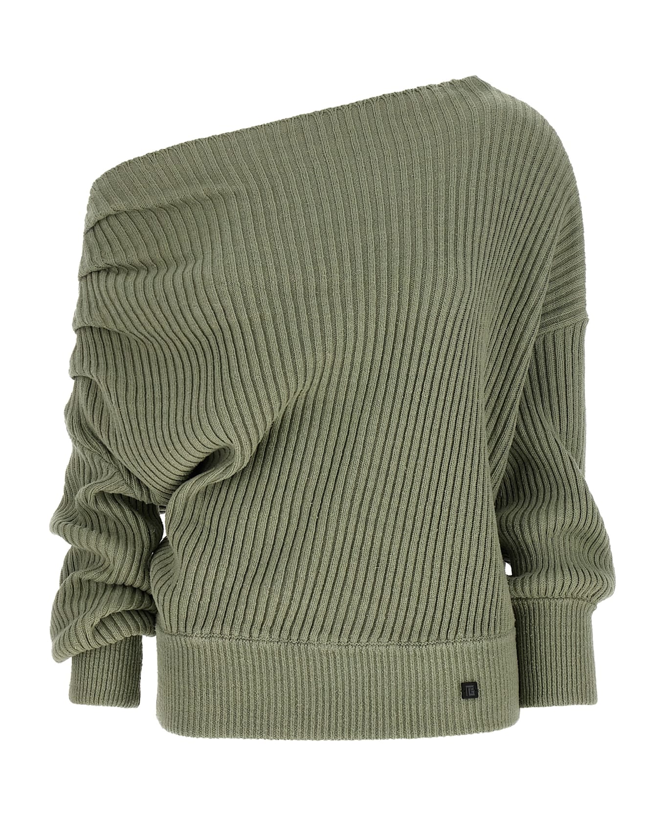 Ribbed knit, asymmetric neckline. Folded with draping on the shoulder, front logo application, ribbed trim on the cuffs and on the bottom of the garment. Composition: 100% silk