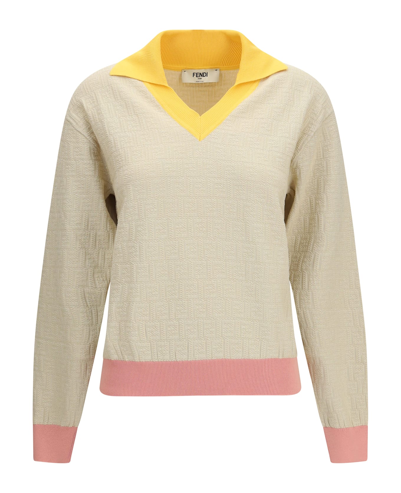 The cotton and silk sweater with ff logo by fendi combines luxury and contemporary style in a distinctive piece. featuring long sleeves, a collar, and a v-neck with a double-layer effect, it is crafted from a cotton and silk blend for softness and comfort. the iconic ff jacquard motif covers the entire sweater, while contrasting ribbed edges and collar complete the elegant and refined design. perfect for sophisticated and modern looks.