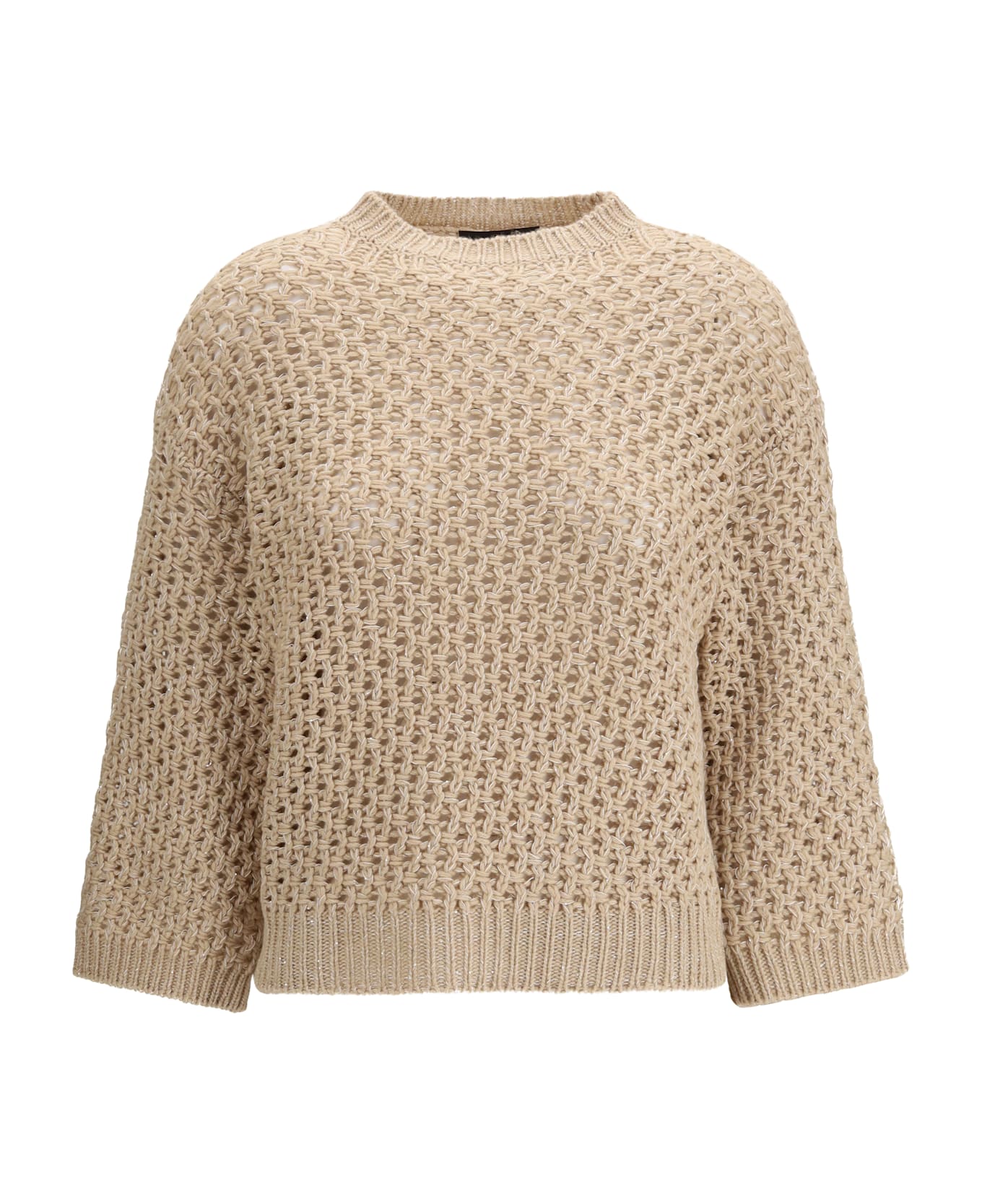 The jumper by fabiana filippi, crafted from platinum yarn with micro sequins, blends softness, luminosity and understated elegance in a contemporary design. the crew neck and honeycomb knit texture enhance the structure of the piece, creating a refined and subtly three-dimensional effect. made entirely in italy through sustainable processes, it adds radiance and femininity while keeping a clean, sophisticated aesthetic.