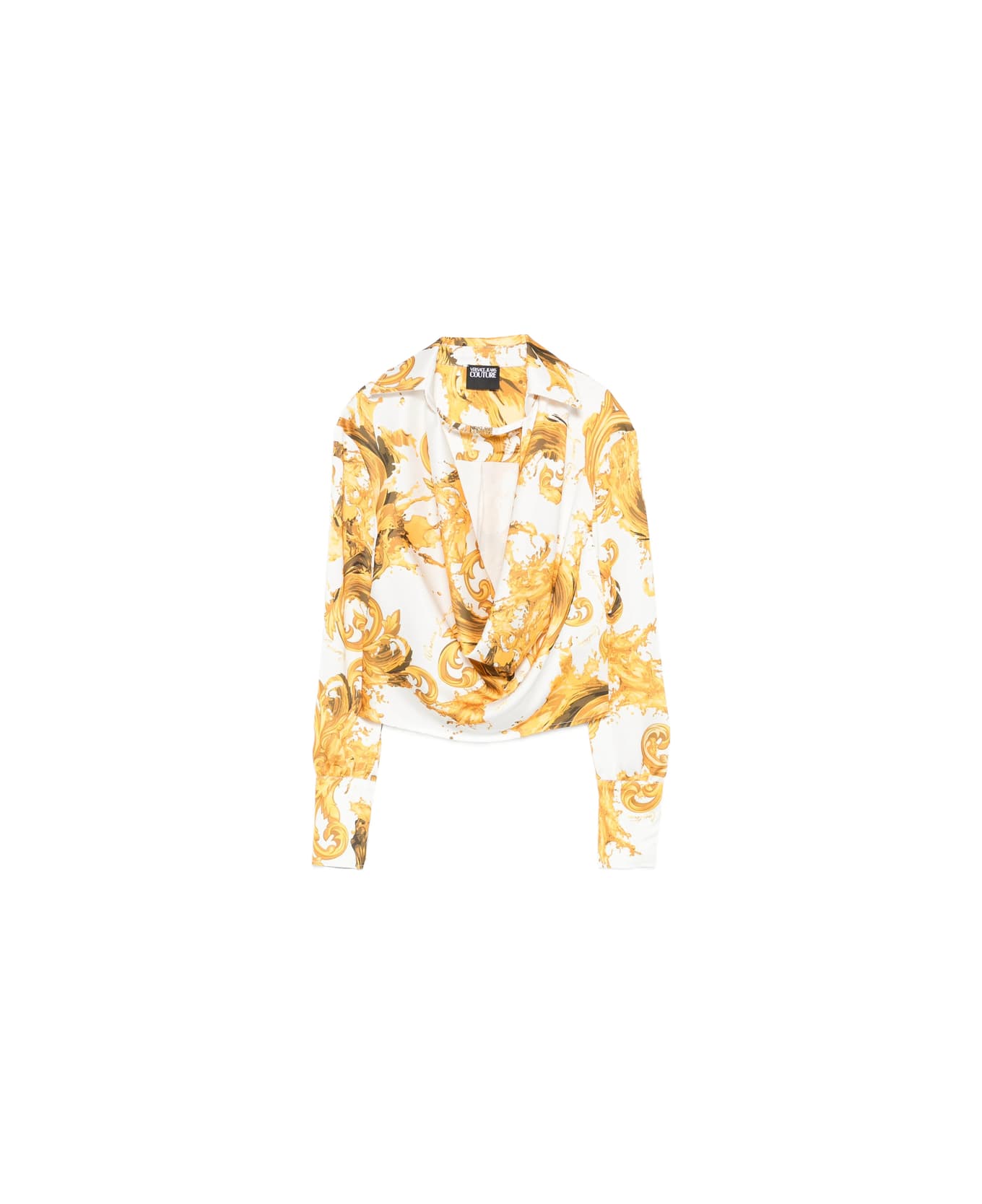 white and gold baroque print draped detailing long sleeves buttoned cuffs classic collar logo plaque