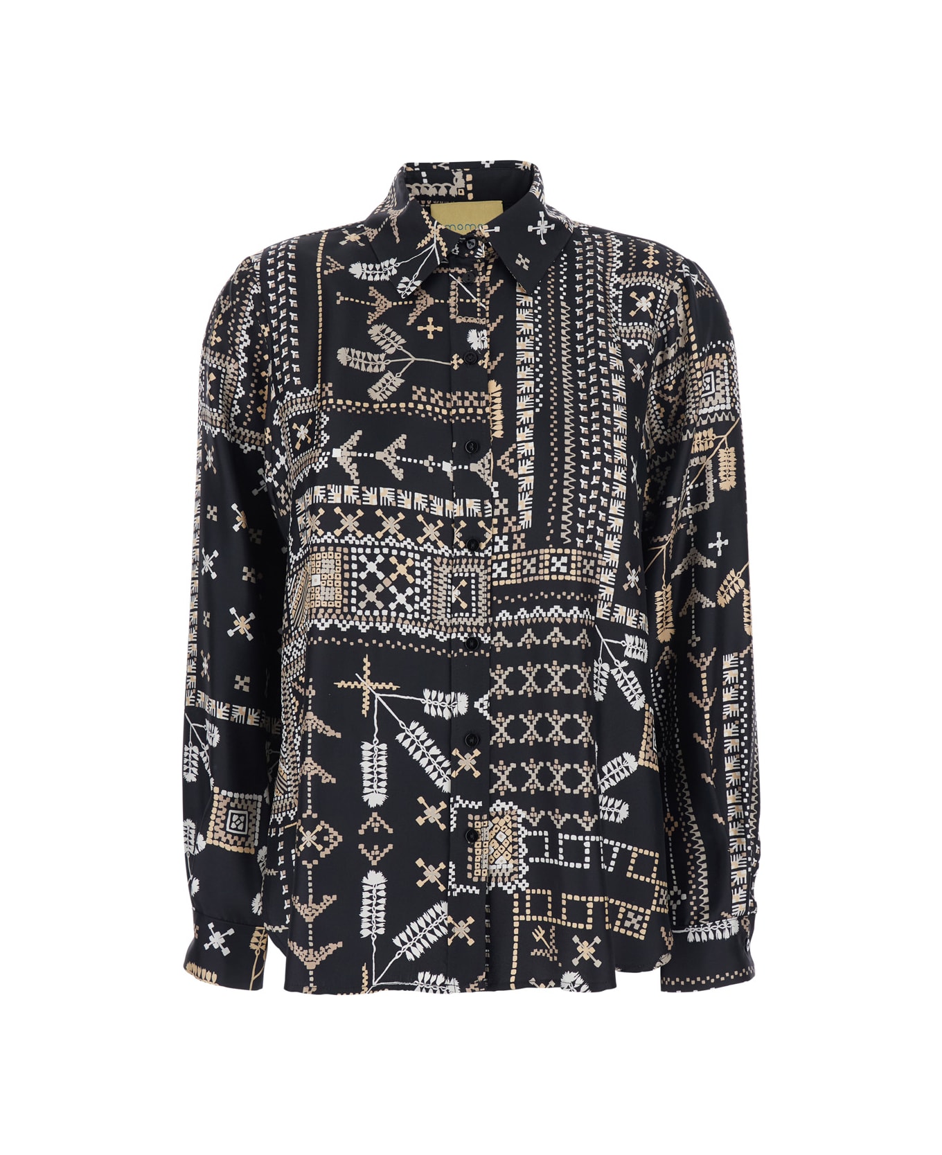 Black Shirt With All-over Print And Pointed Collar In Silk Woman