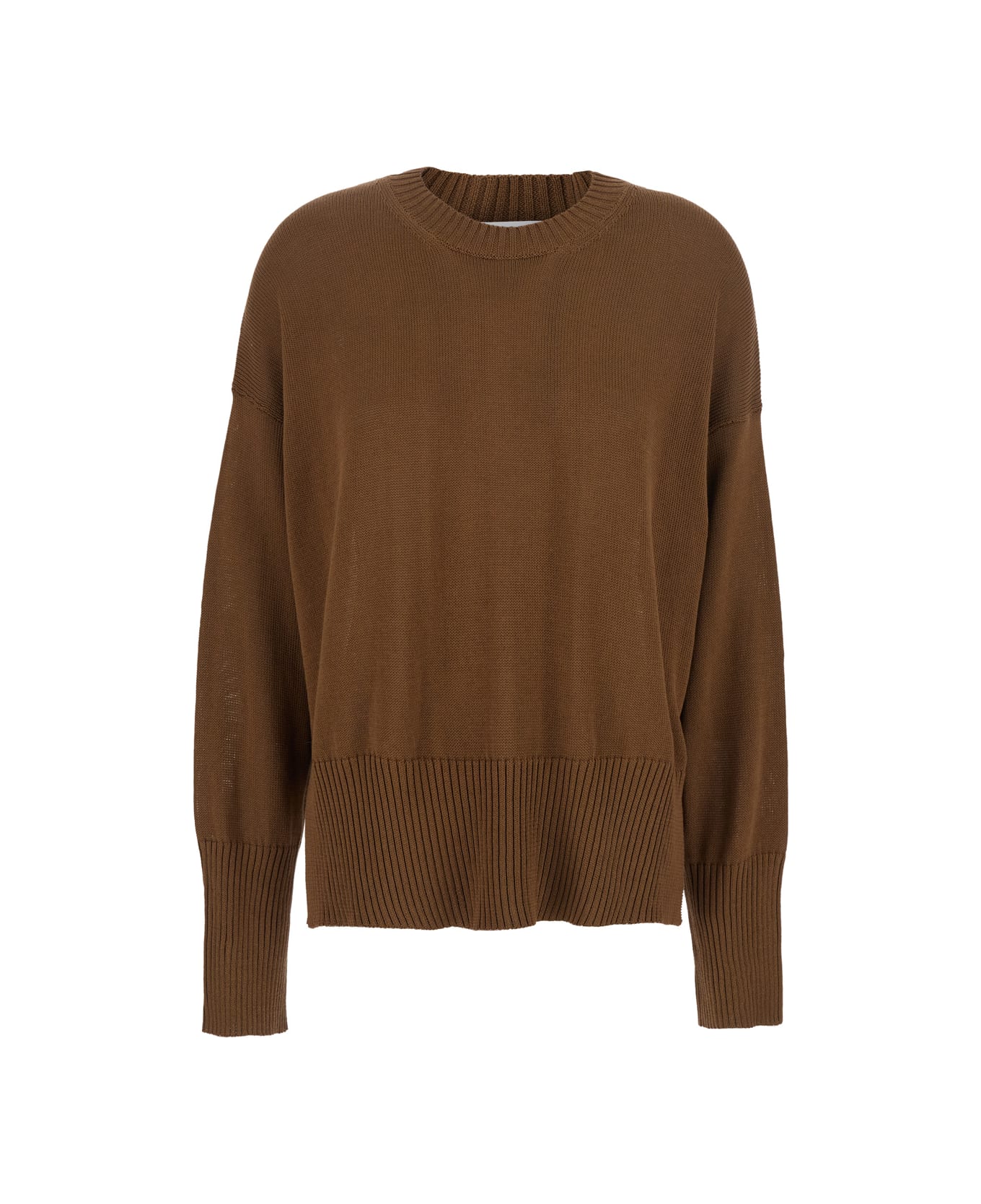 Brown Crewneck Sweater With Ribbed Trims In Cotton Woman