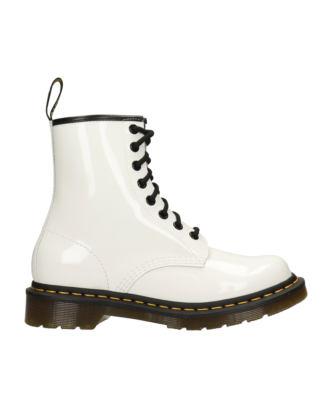 1460 Combat boots in white patent leather, laces, almond toe, iconic logo, pull tab on backside, 100% leather, rubber outsole, Made in Vietnam