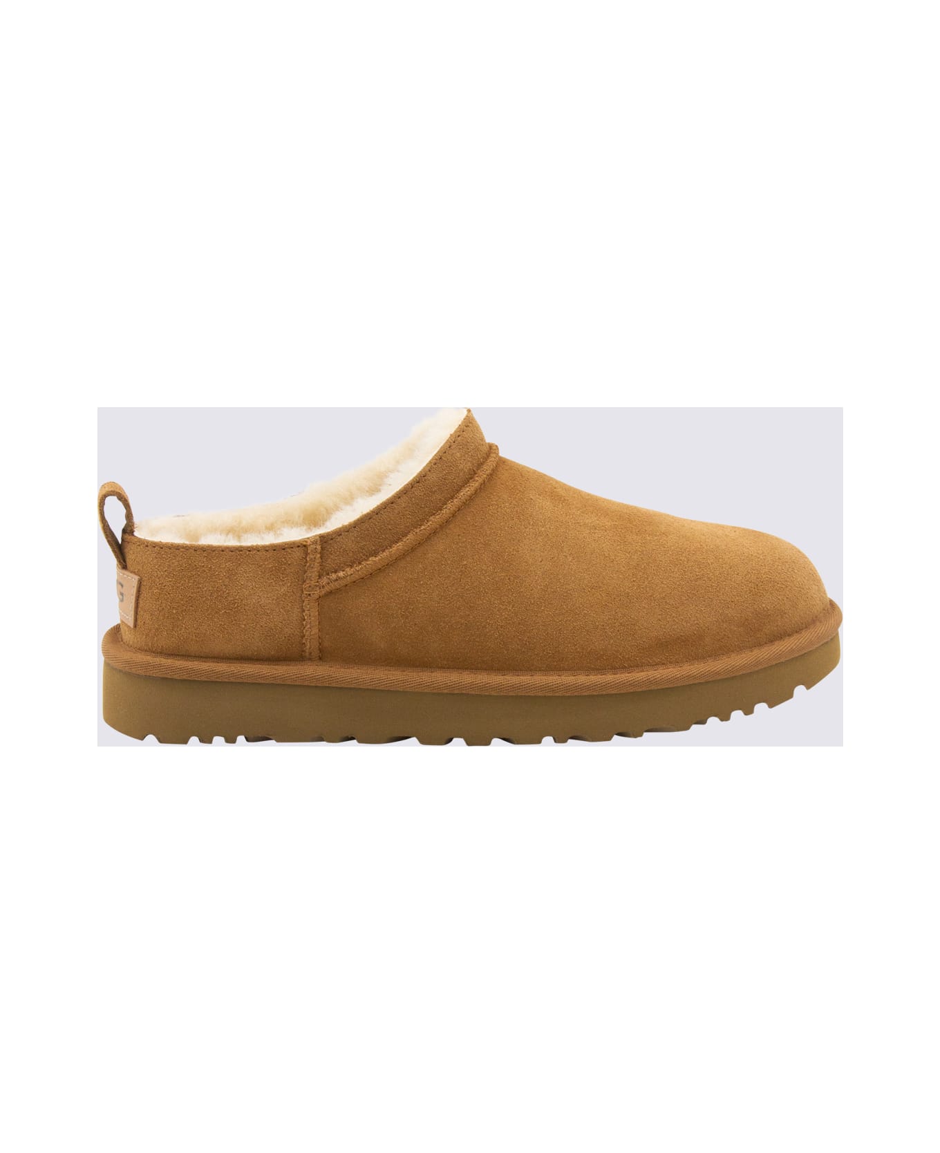 Camel Classic Micro boots from Ugg featuring round toe, slip-on style, leather sole and logo patch.