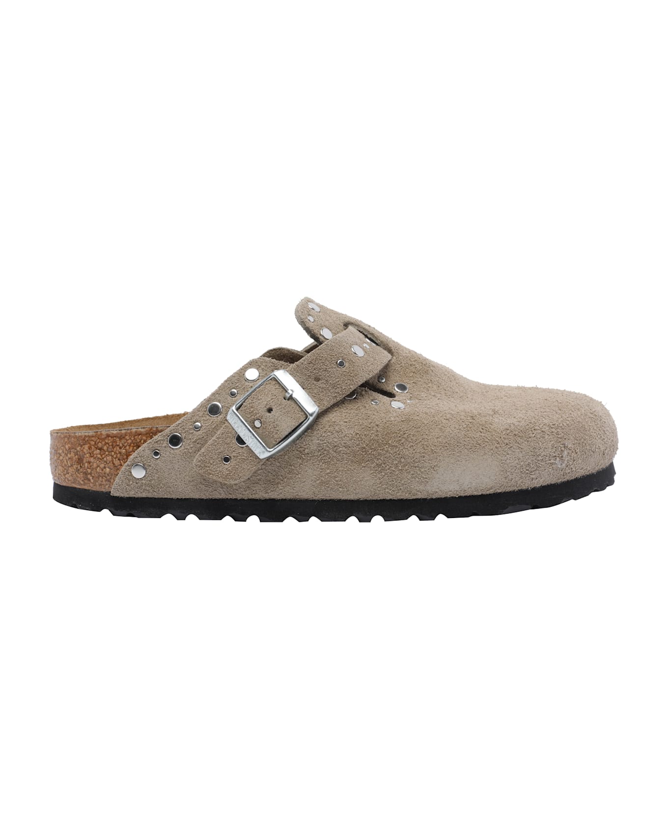 Birkenstock beige Boston Rivet mules, round toe, suede upper, studs detail