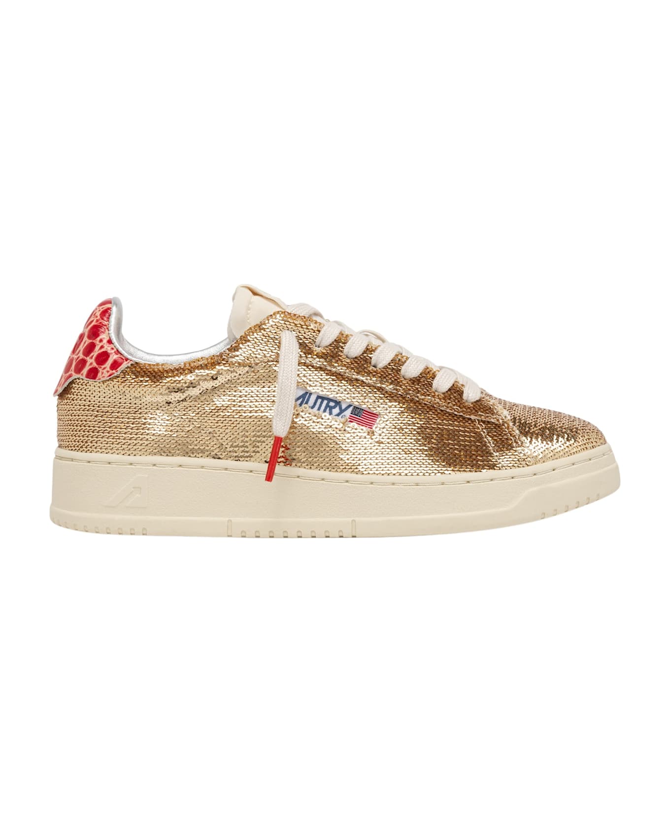 Sneakers Autry "Dallas Low" in pelle, ineramente rivestita di paillettes color oro, con punta tonda e chiusura con lacci. Dettagli logati su linguetta e tallone. Tallone color rosso pallido. Dustbag inclusa.