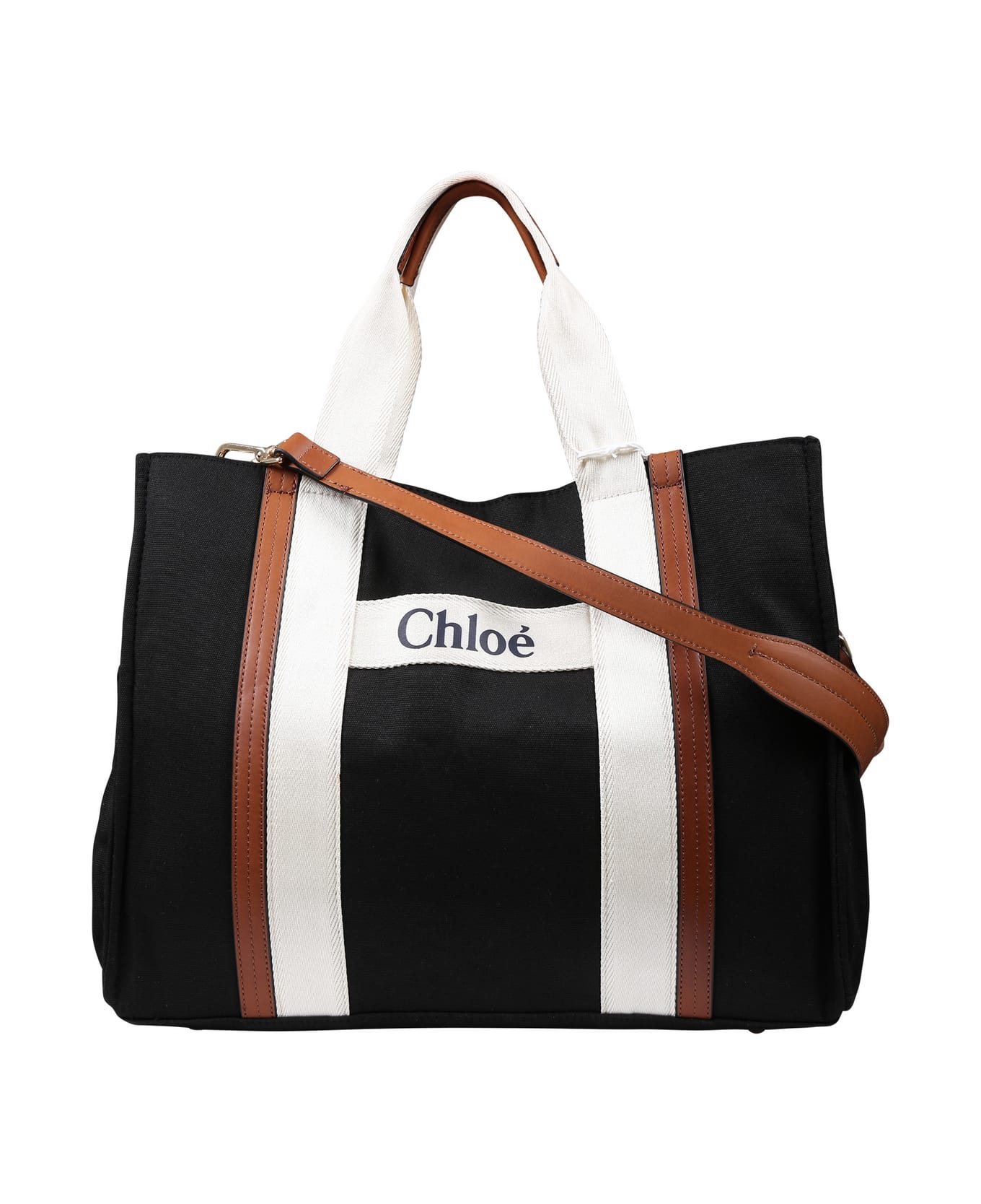 Black changing bag, with handles, removable shoulder strap, removable internal pochette, portable changing mat, side pockets, front pocket and internal clip closure. It is embellished with logo on the front. 39 x 33 x 13 cm.
