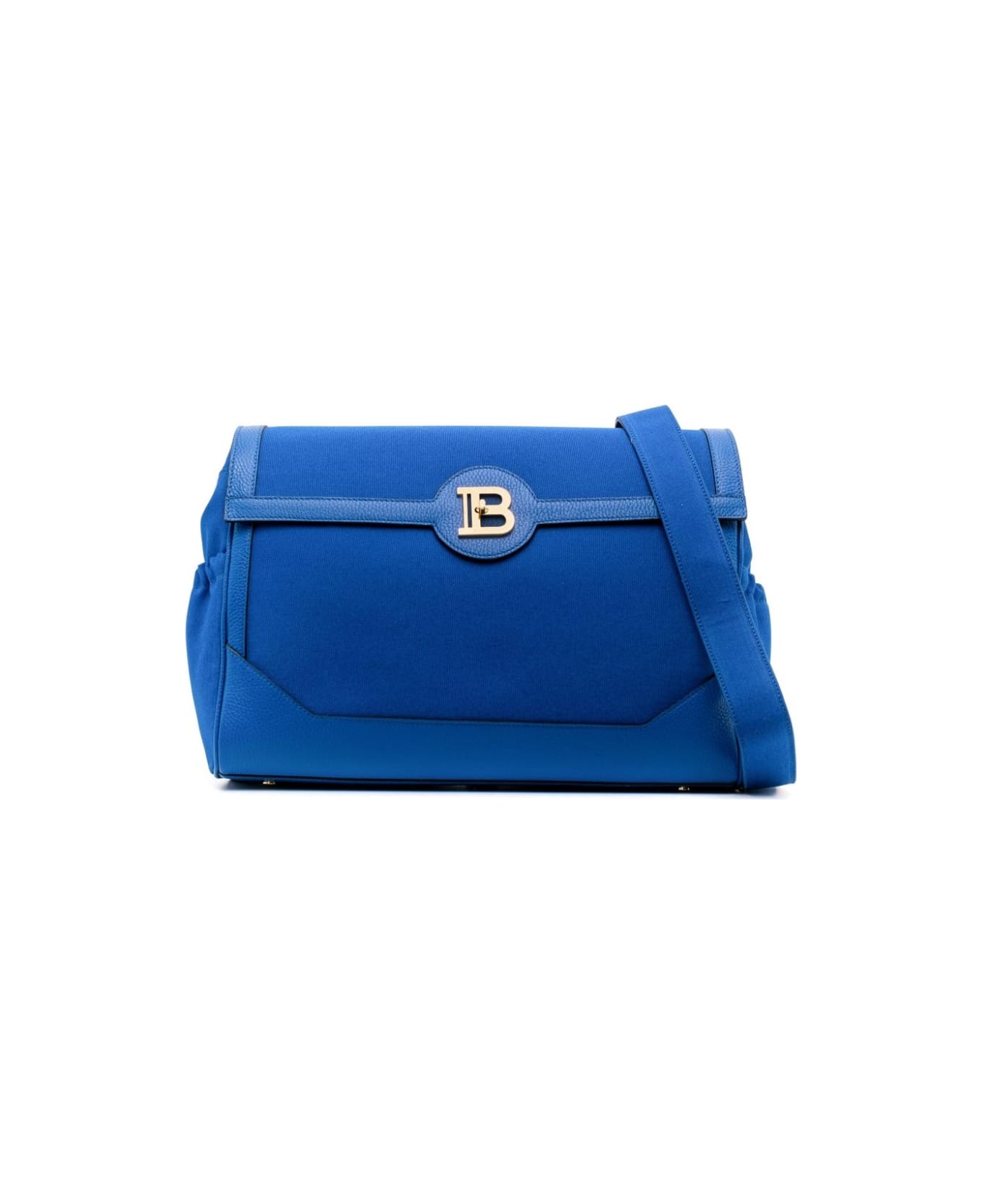logo-plaque panelled changing bag from Balmain Kids featuring royal blue, cotton, calf leather, grained texture, panelled design, gold-tone logo plaque, detachable shoulder strap, foldover top, twist-lock closure, slip pockets to the sides, main compartment, internal logo patch, internal zip-fastening pocket and changing mat.