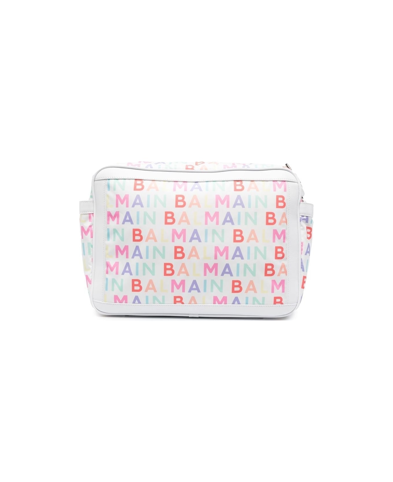 logo-print changing bag from Balmain Kids featuring all-over logo print, two side patch pockets, adjustable shoulder strap, top zip fastening, main compartment, internal zip-fastening pocket, internal logo patch, white/multicolour and cotton.