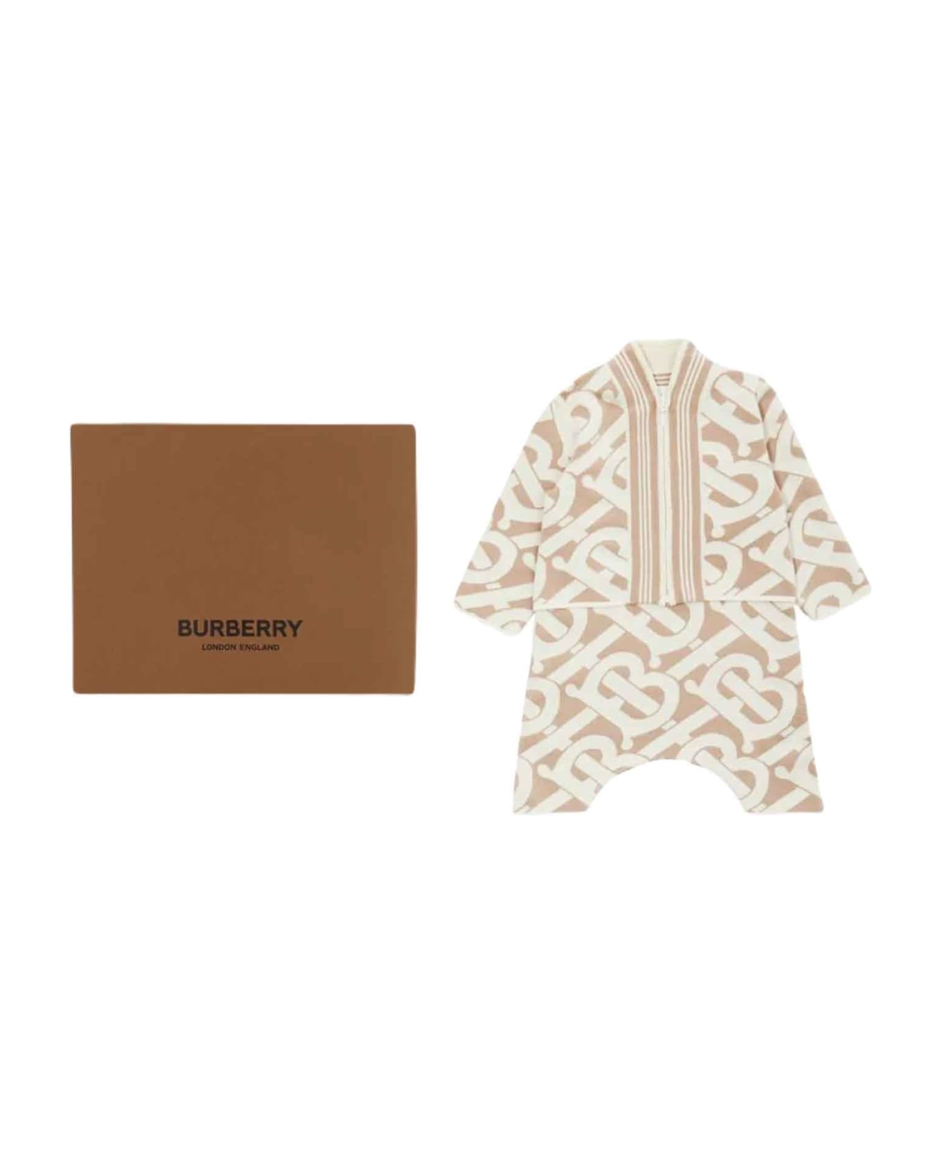 Beige set baby unisex. All-over monogram print, snap button closure, sleeveless design, front zip closure, long sleeves and straight hem. Silk 47%, Cotton 47%, Polyamide 4%, Elastane 2%