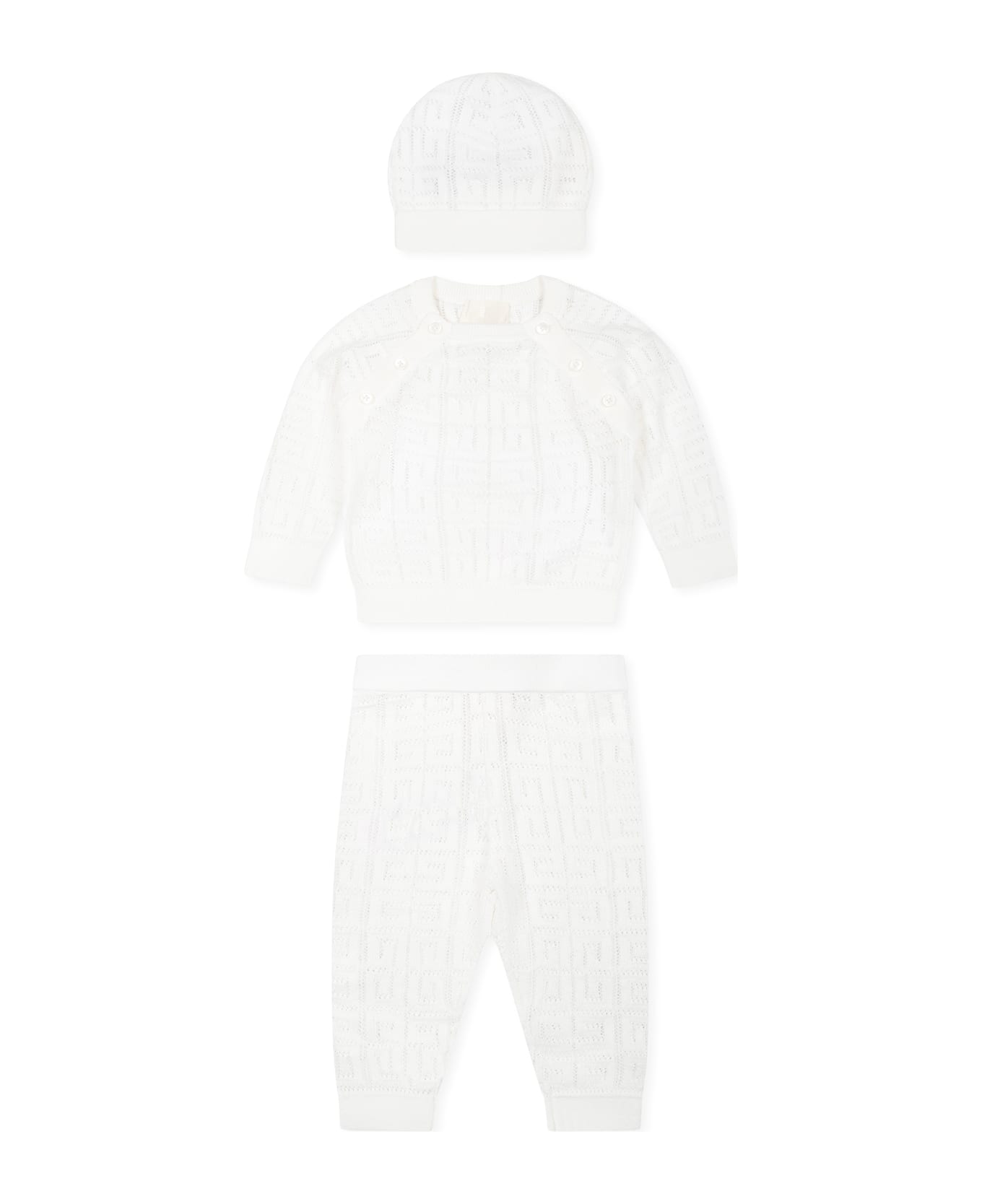 Ivory birth suit from the French luxury brand Givenchy, made of cotton, consisting of a sweater, trousers and hat. Long-sleeved sweater, with crew neck, side button closures on the front, ribbed cuffs and hem; trousers with elasticated waist; hat with cuff. It is embellished with iconic all-over perforated 4G motif.