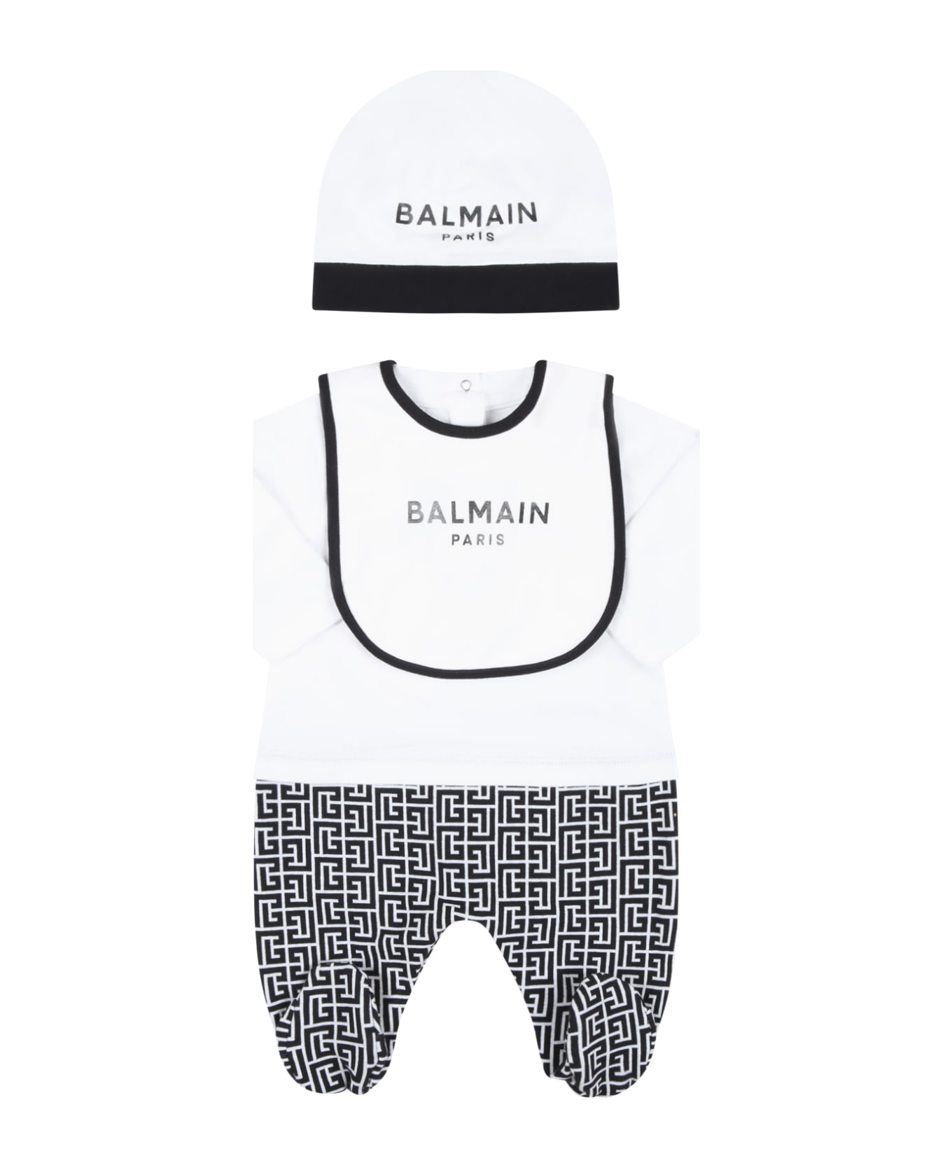 Black and white set composed of romper, bib and hat. White and black jumpsuit in cotton, with long sleeves, ribbed crew neck, closure with automatic buttons on the back and between the legs and feet; it is embellished with black logo on the front and black print on the bottom. White bib in cotton with automatic button closure on the side; it is embellished with black piping and black logo on the front. White hat with black brim embellished with black logo on the front.