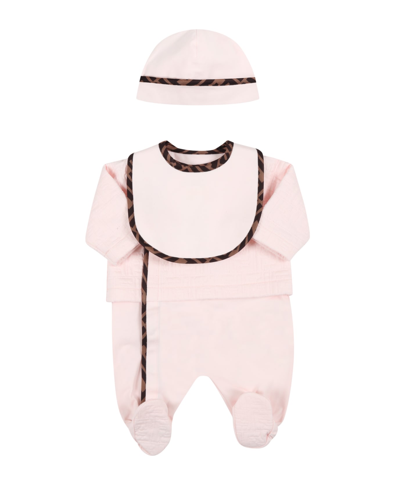 Pink set, with babygrow, bib and hat; babygrow with crew-neck, long sleeves, feets and closure with press-studs, on the front; it is embellished with double FF ll-over, on th top and brown trimmig; bib and hat are embellished with nbrown trimming.