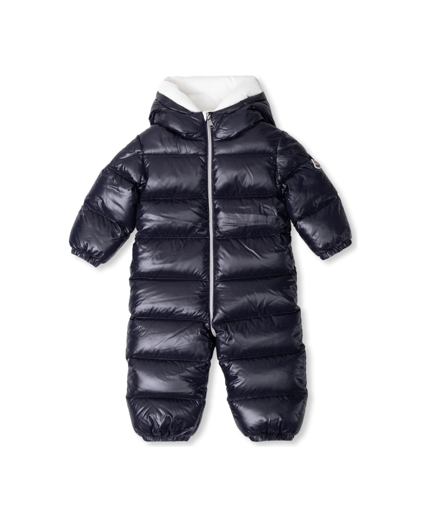 Navy blue 'Samian' down jumpsuit with a ood from Moncler Enfant. Crafted from recycled nylon with a glossy finish, this style fastens with a zip and features a logo patch, two zip pockets and long sleeves and legs with elasticated cuffs.
