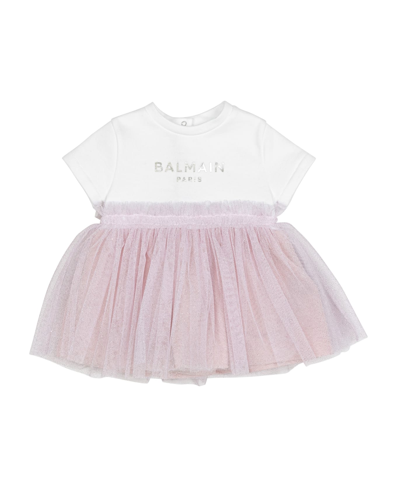 Vestito multicolor con maniche corte, girocollo a costine, chiusura con bottoni automatici sulla parte posteriore, gonna in tulle rosa e culotte interna. È decorato con logo argentato sulla parte anteriore e brillanti sulla gonna.