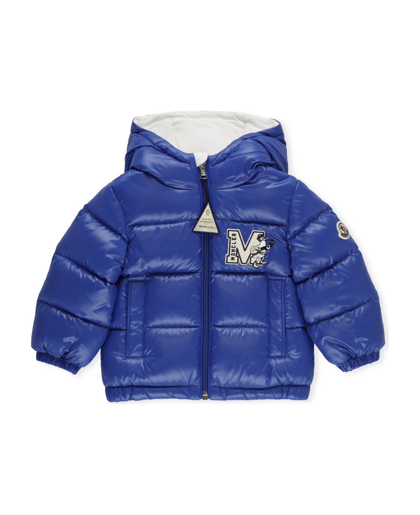 - Blue Moncler Baby down jacket for boy - Hood - High neck - Front contrasting color embroidered logo - Long sleeves - Contrasting color logoed patch at sleeve - Two front pockets with button fastening - Front zip fastening