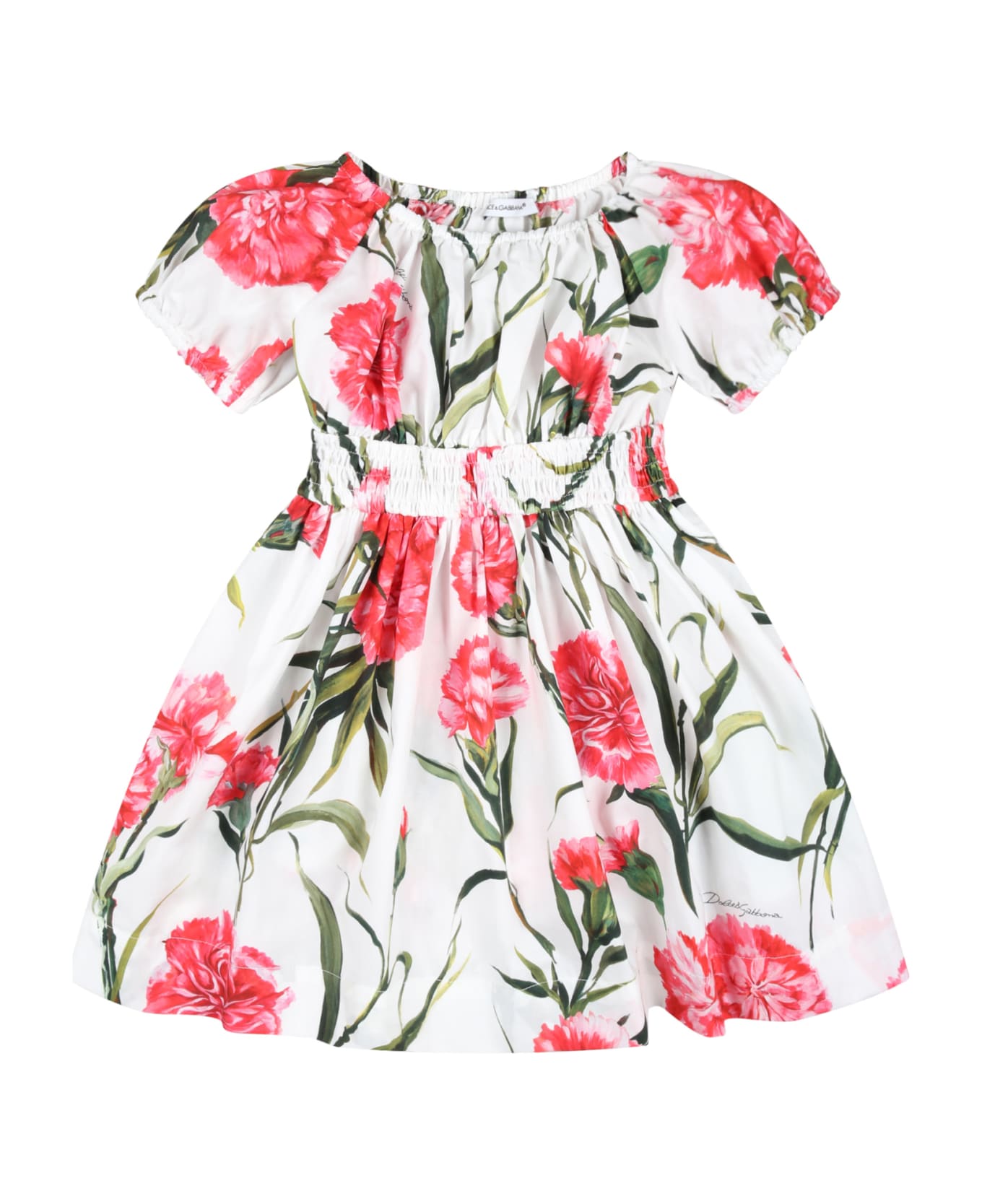 White dress in cotton, with short sleeves, elasticated crew neck and waist and internal culotte. It is embellished with all-over pink carnations.