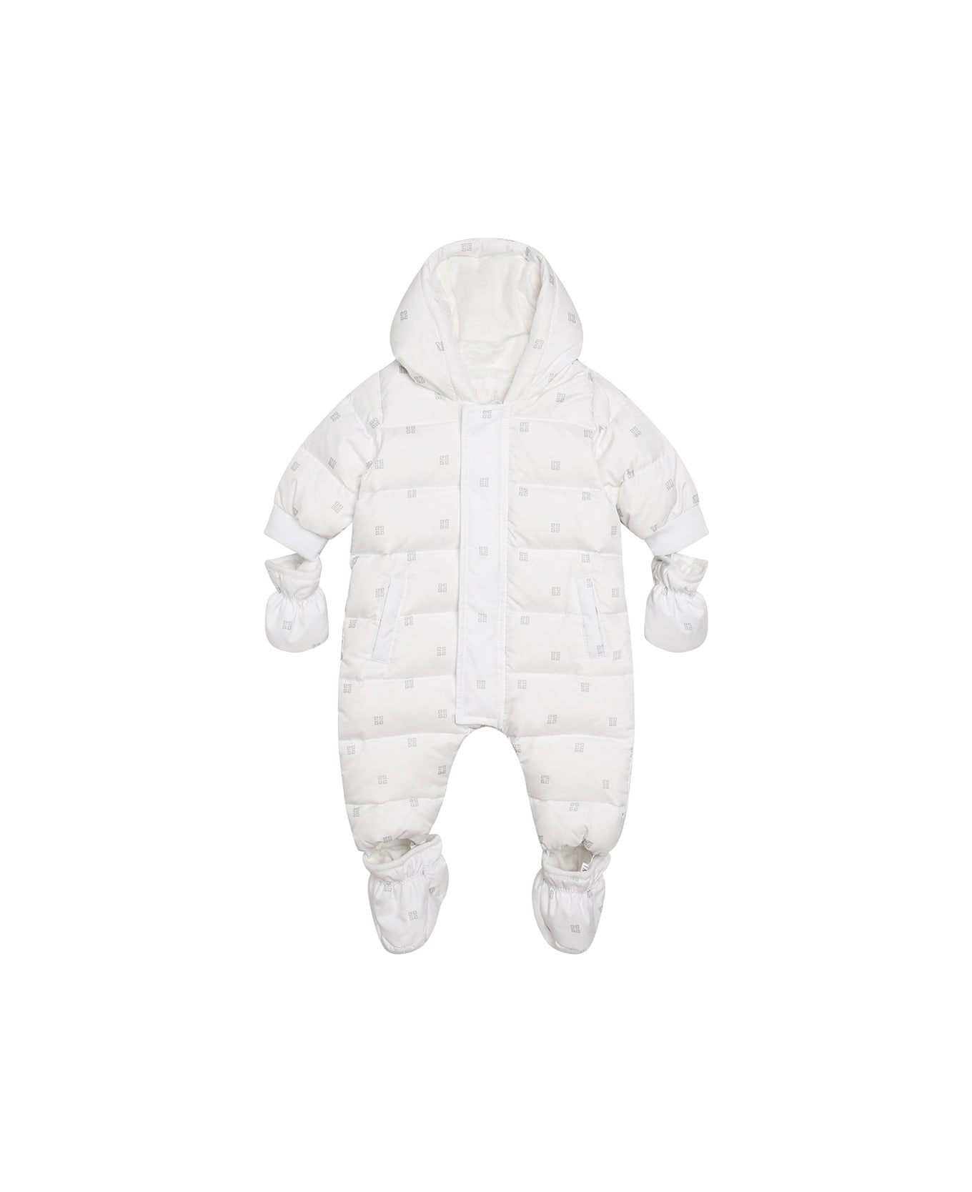 GIVENCHY Kids snowsuit in white quilted nylon with warm padding, contrasting 4G all-over pattern and contrasting embroidered GIVENCHY logo on the back. Featuring a hood, long sleeves, elasticated trims, removable gloves and feet and a covered front fastening.
