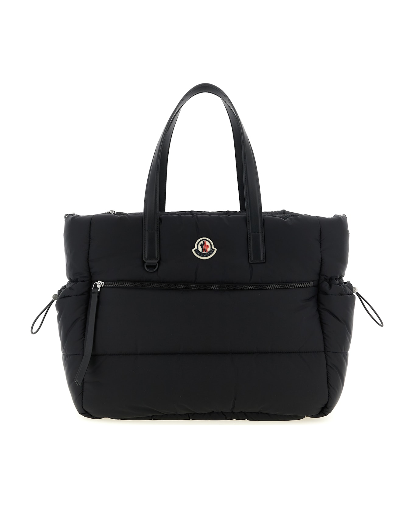 Quilted and padded nylon changing bag with multi-pocket style, front logo patch, double fixed leather handle, top zip closure, adjustable and removable shoulder strap, foldable padded mattress for change, removable hooks for attachment to the stroller.
