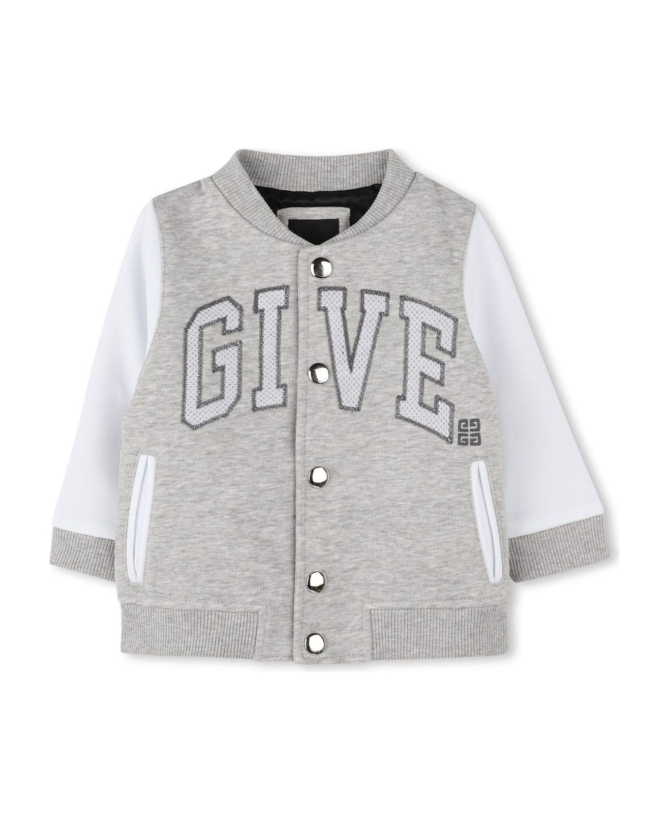 Grey organic cotton blend jacket, appliqué logo, front press-stud fastening, baseball collar, two side welt pockets, long sleeves, ribbed cuffs and hem Composition: Organic Cotton, 85% , Polyester, 15%