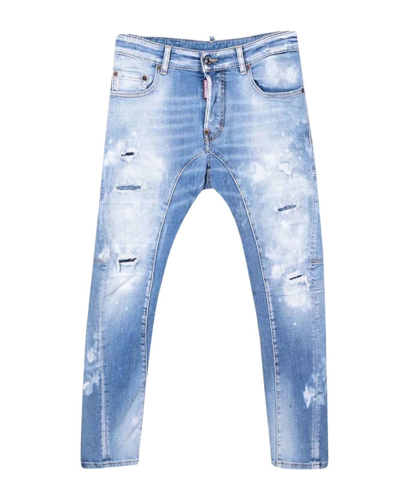 Blue denim trousers boy. Worn effect, details with tears, back logo application, belt loops, front closure with buttons and zip, classic five-pocket design and tapered leg. Cotton 99%, Spandex / Elastane 1%