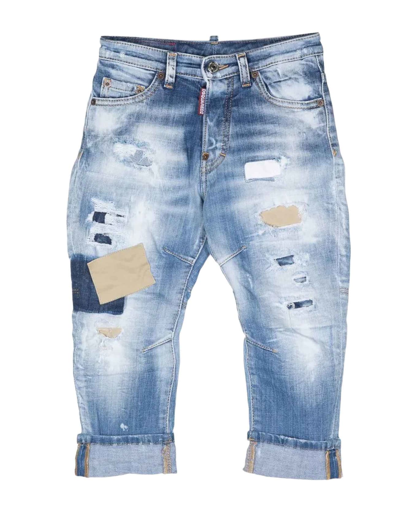 blue denim trousers boy. Patchwork design, front button closure, two diagonal side pockets and two shaped back pockets. Cotton 98%, Elastane 2%