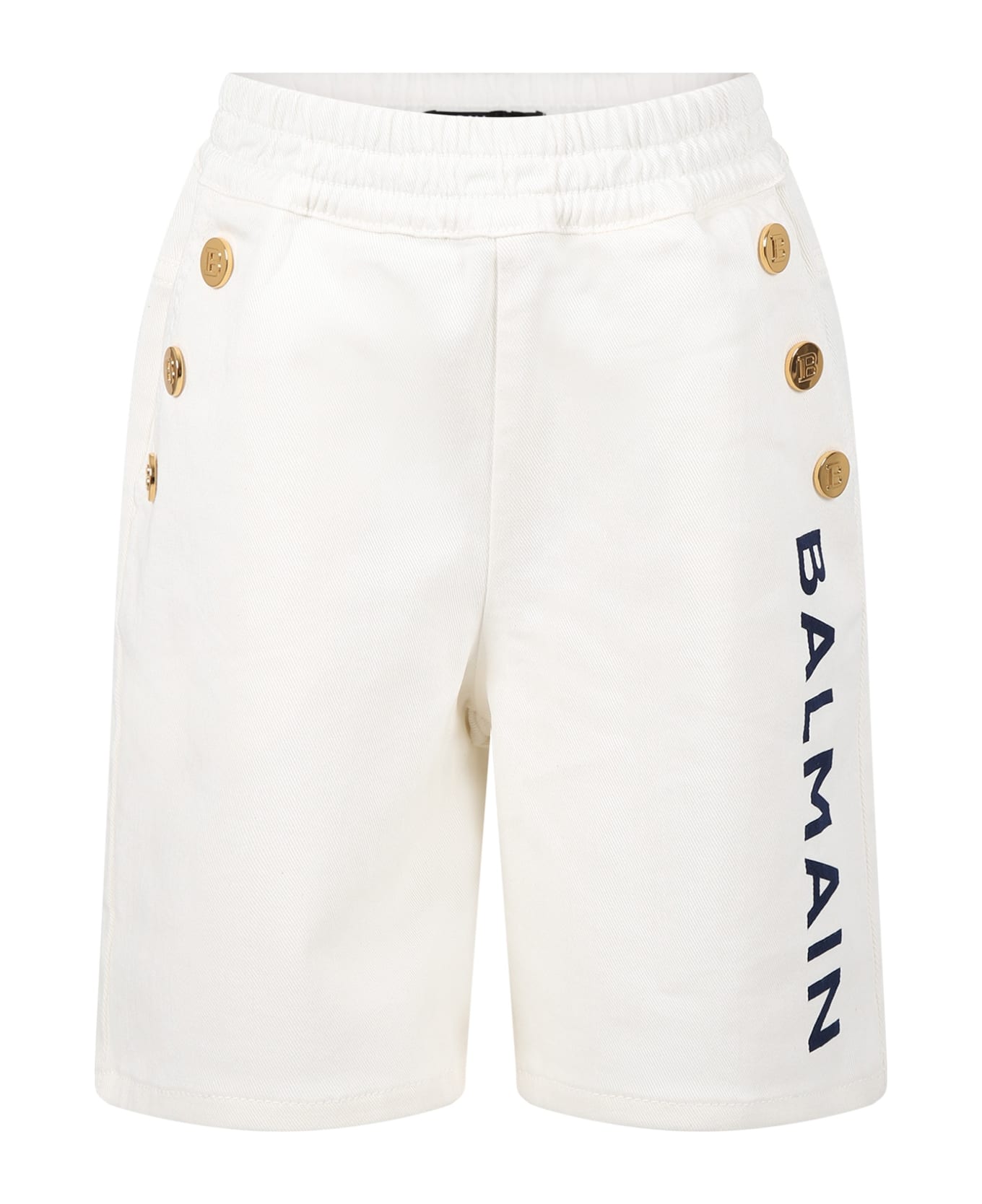 Ivory casual shorts, with elastic waistband, side pockets. They are embellished with golden buttons with logo on the sides, with logo print on the leg.