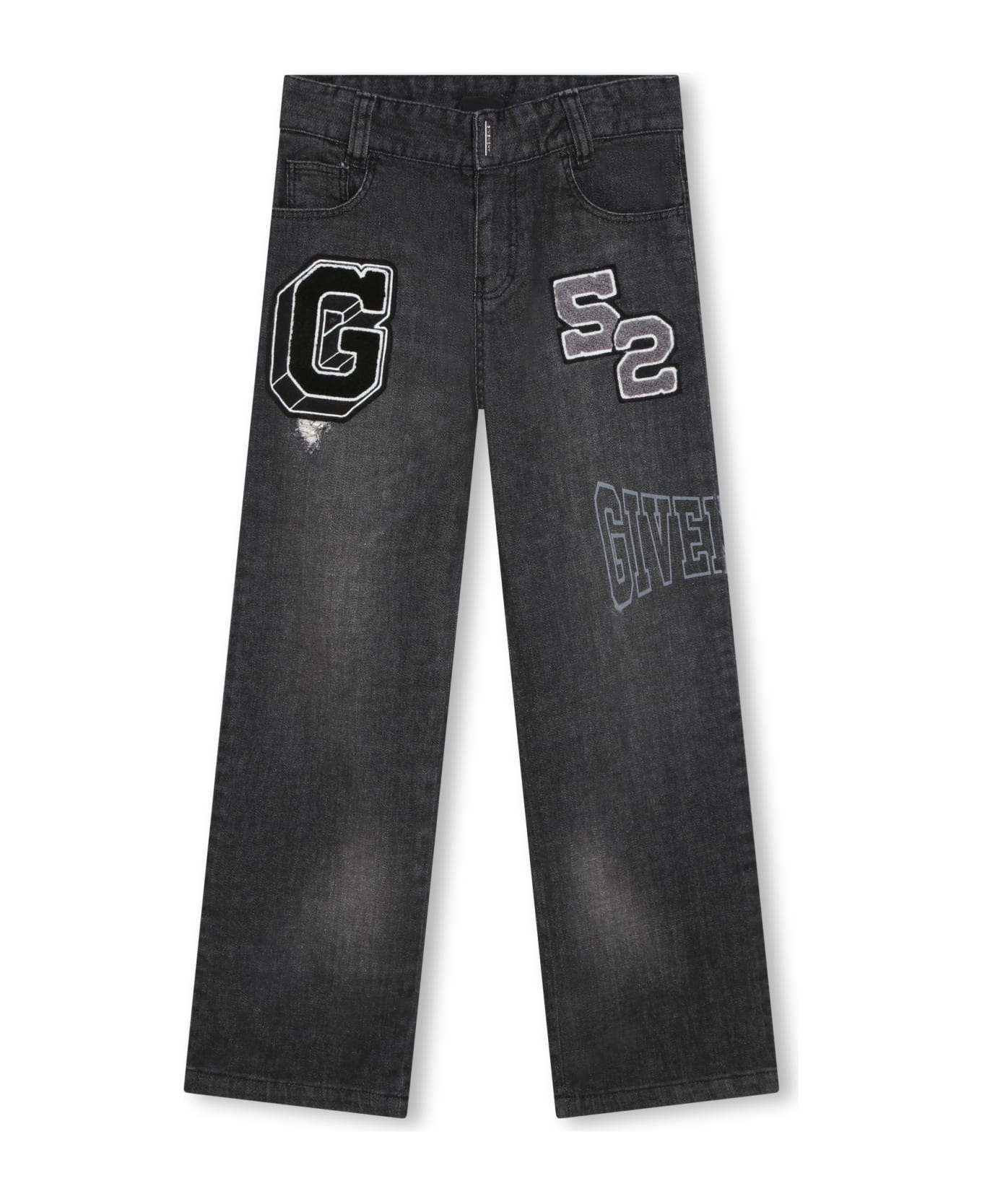 logo-embroidered cotton jeans from Givenchy Kids featuring black, cotton, logo patch to the rear, embroidered logo at the leg, star print, number patch to the rear, logo print at the leg, mid-rise, straight leg, front button and zip fastening, belt loops and classic five pockets.