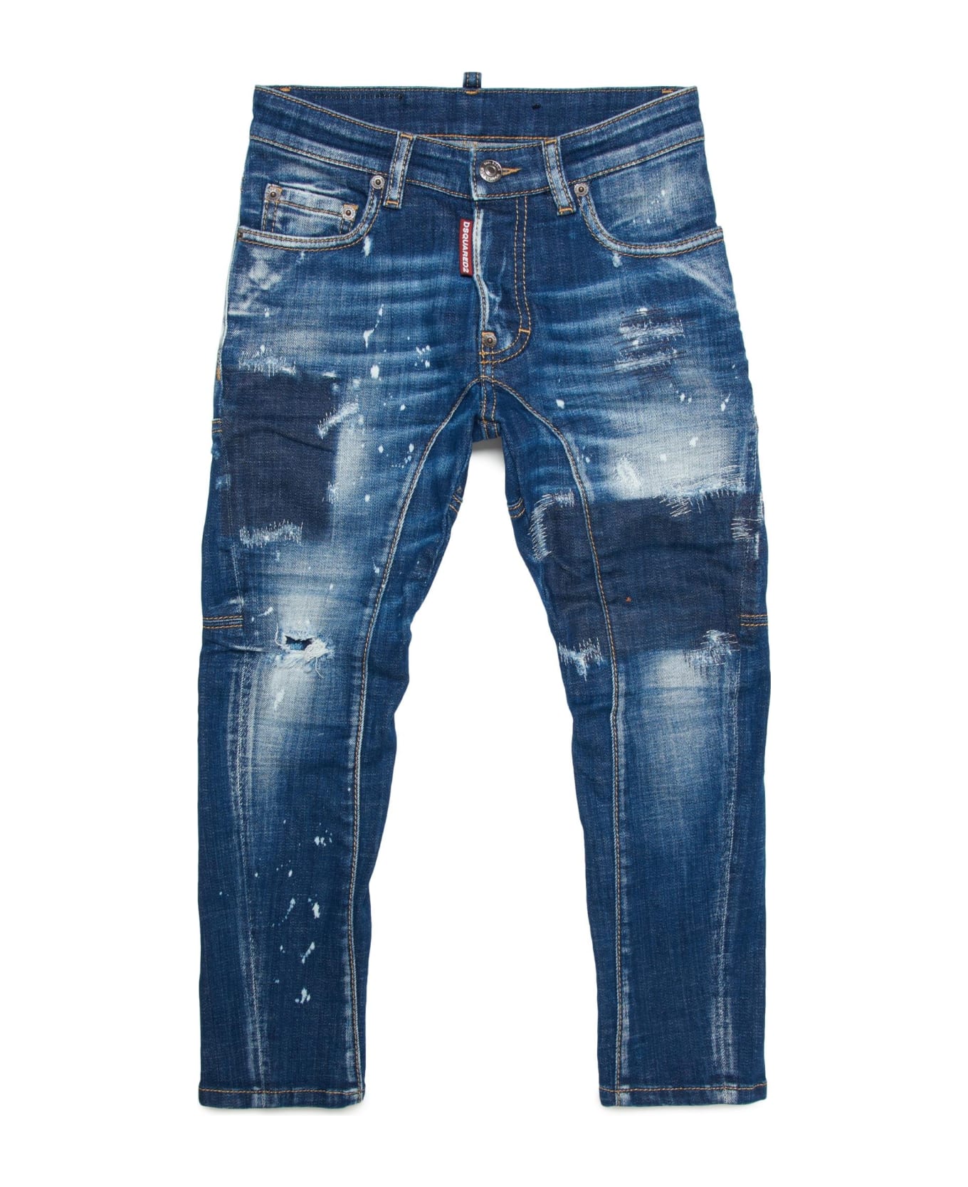 Indigo, cotton blend, worn effect, patent effect detail, slim fit, straight cut, back logo patch and front button and zip fastening. Composizione
