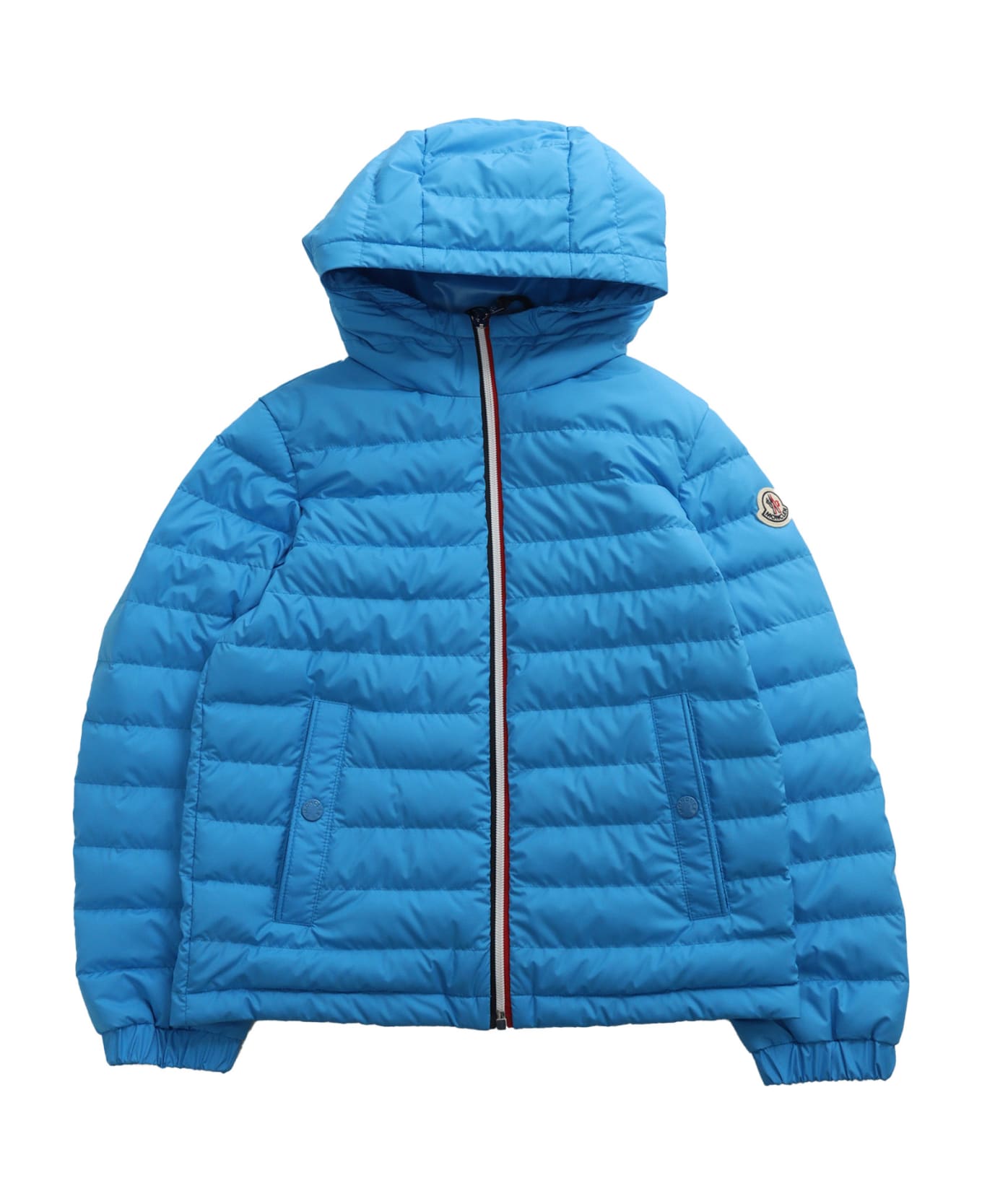Quilted down jacket, hood, feather padding, zip fastening, side pockets, logo patch on the sleeve