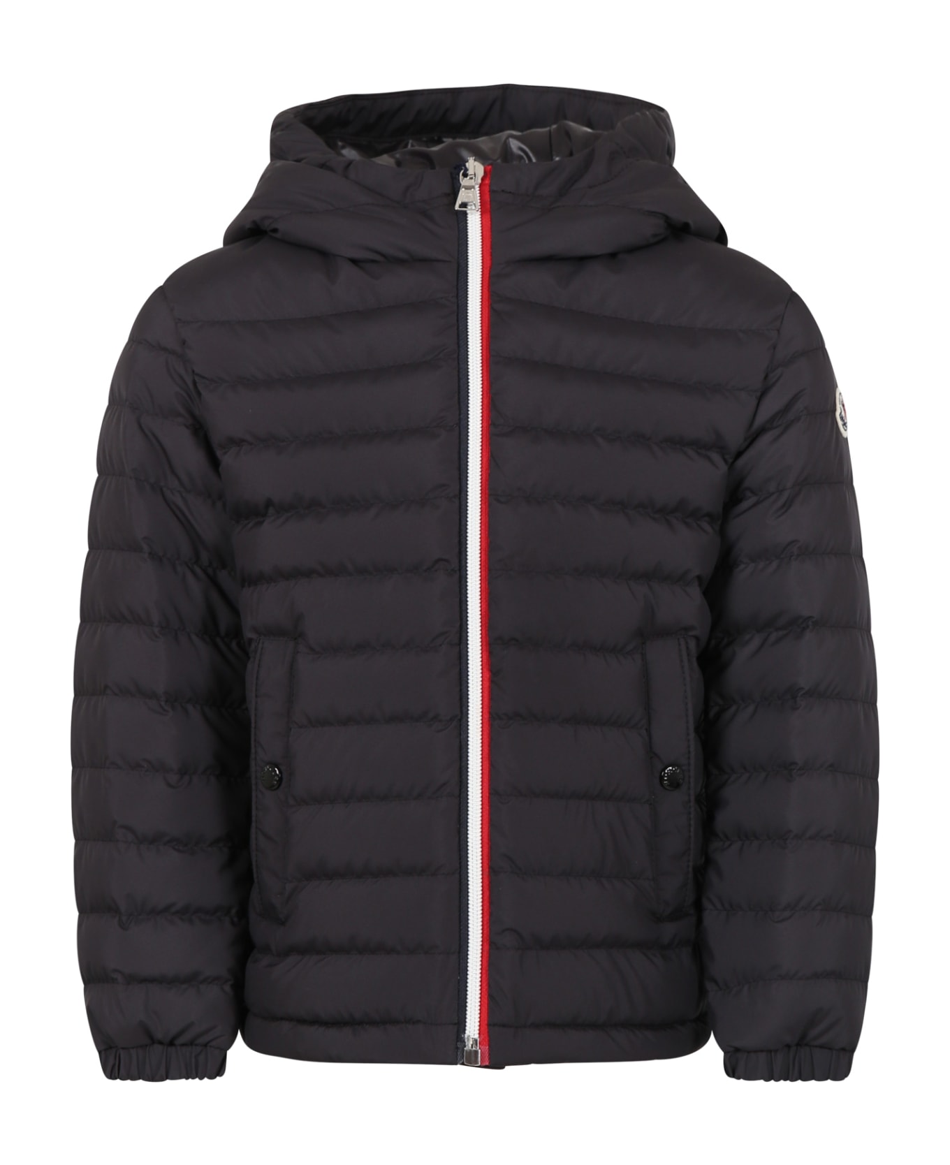 Black down jacket, zip closure on the front, side pocket with press studs on the sides. It is embellished with logo patch on the sleeve.