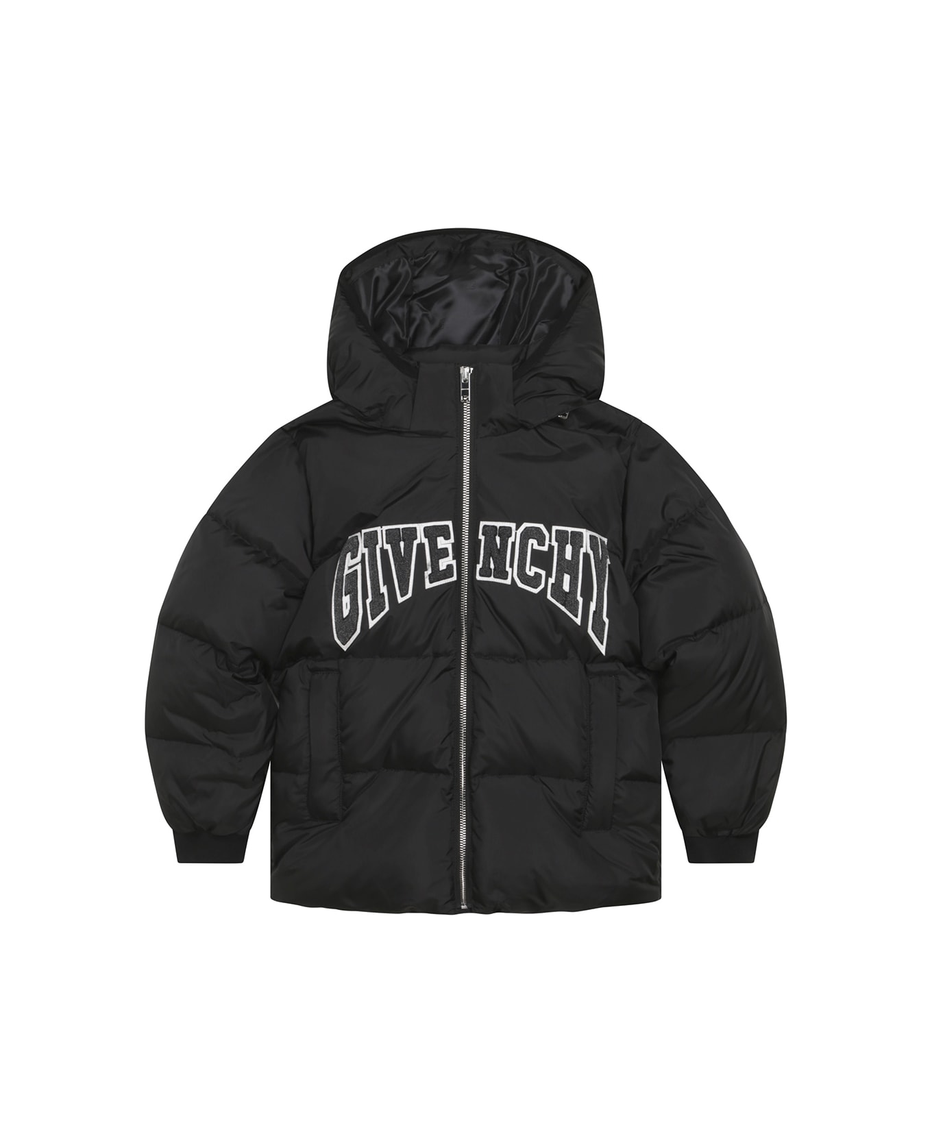 Black down jacket by GIVENCHY Kids made of quilted nylon and decorated with black and white GIVENCHY signature embroidered on the front. The jacket features a high collar, a removable hood, long sleeves, side pockets and a front zip fastening.