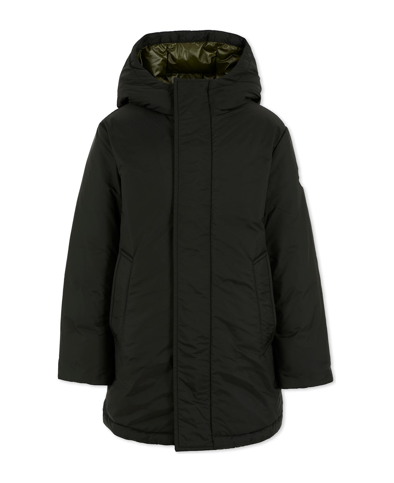 Heavyweight black, padded and quilted parka with long sleeves, a hood, a zip-front closure, and side pockets with snap buttons. It is embelished with an iconic logo patch applied on the sleeve.