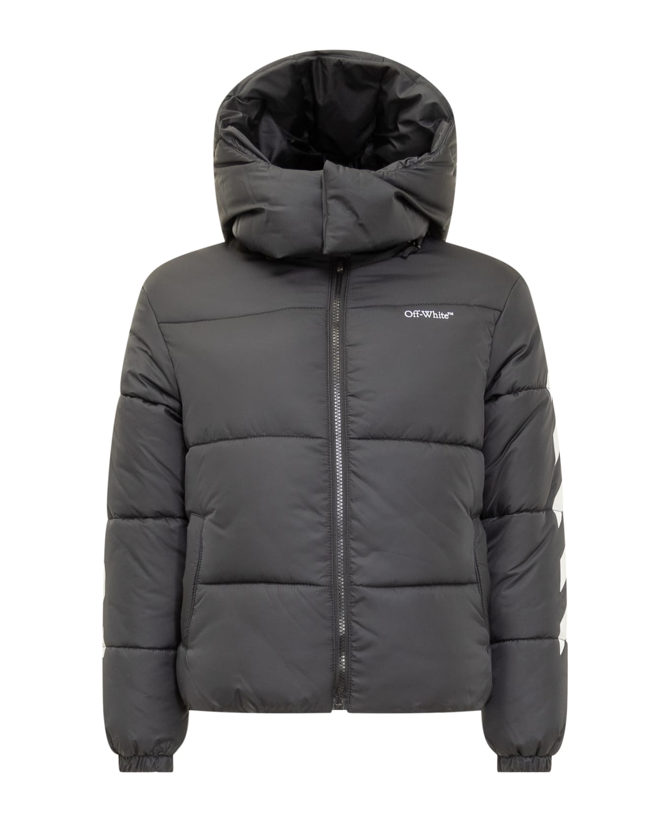 Black down jacket with long sleeves. Hood. Front zip closure. Side pockets. Logo printed on the chest.