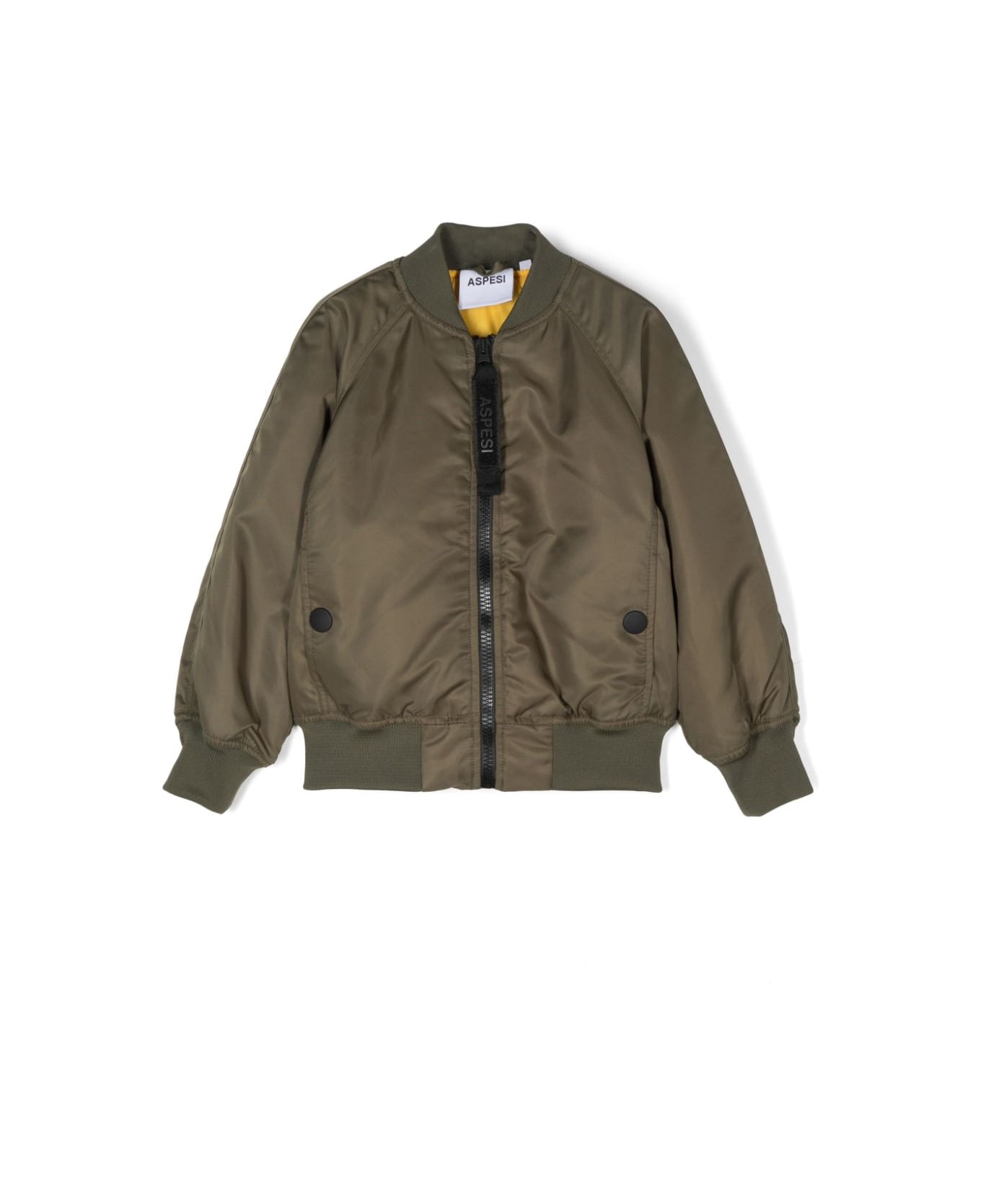 Aspesi Kids green bomber jacket. Embossed finish, front zip closure, low ribbed collar, long sleeves, ribbed hem and cuffs, zip sweater, two side welt pockets, quilted lining. 100% polyamide