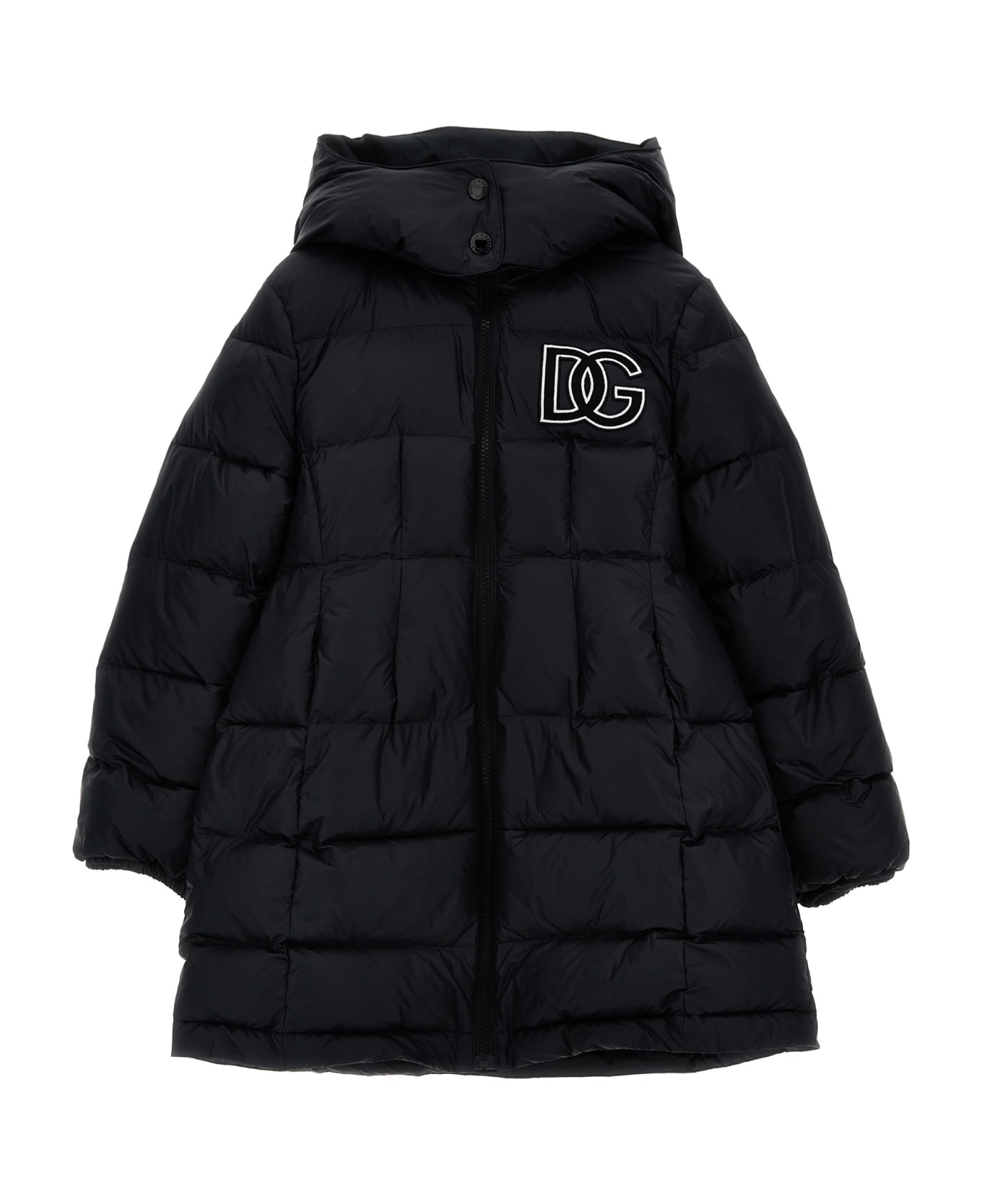 Long padded nylon down jacket with front logo embroidery, removable hood, zip closure, pockets, and long sleeves with elastic cuffs. Composition: 100% polyamide