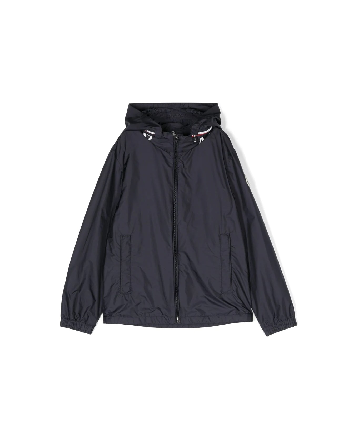 Navy blue Aidrian hooded jacket by Moncler Enfant made of a technical nylon fabric with a water-repellent and extremely smooth finish. The garment features a logo print, uncle fastening, logo patch on the sleeve, removable hood with tricolour hem, elasticated cuffs and hem, and welt pockets with snap button.