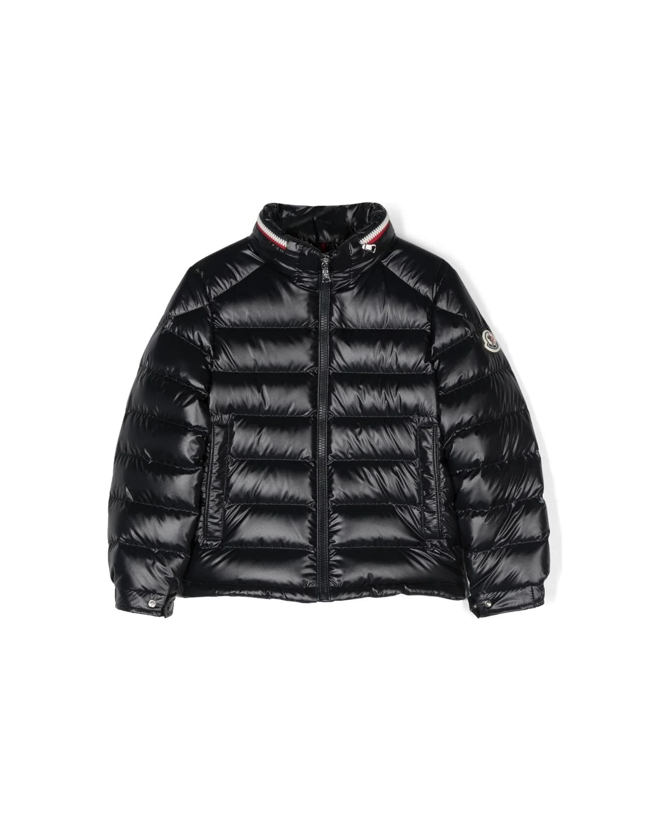Navy blue Bourne down jacket from Moncler Enfant made of recycled polyester and featuring down filling, elasticized cuffs, recycled polyester lining, functional zipper closure, flush snap pockets and a removable tricolor hood for maximum practicality.