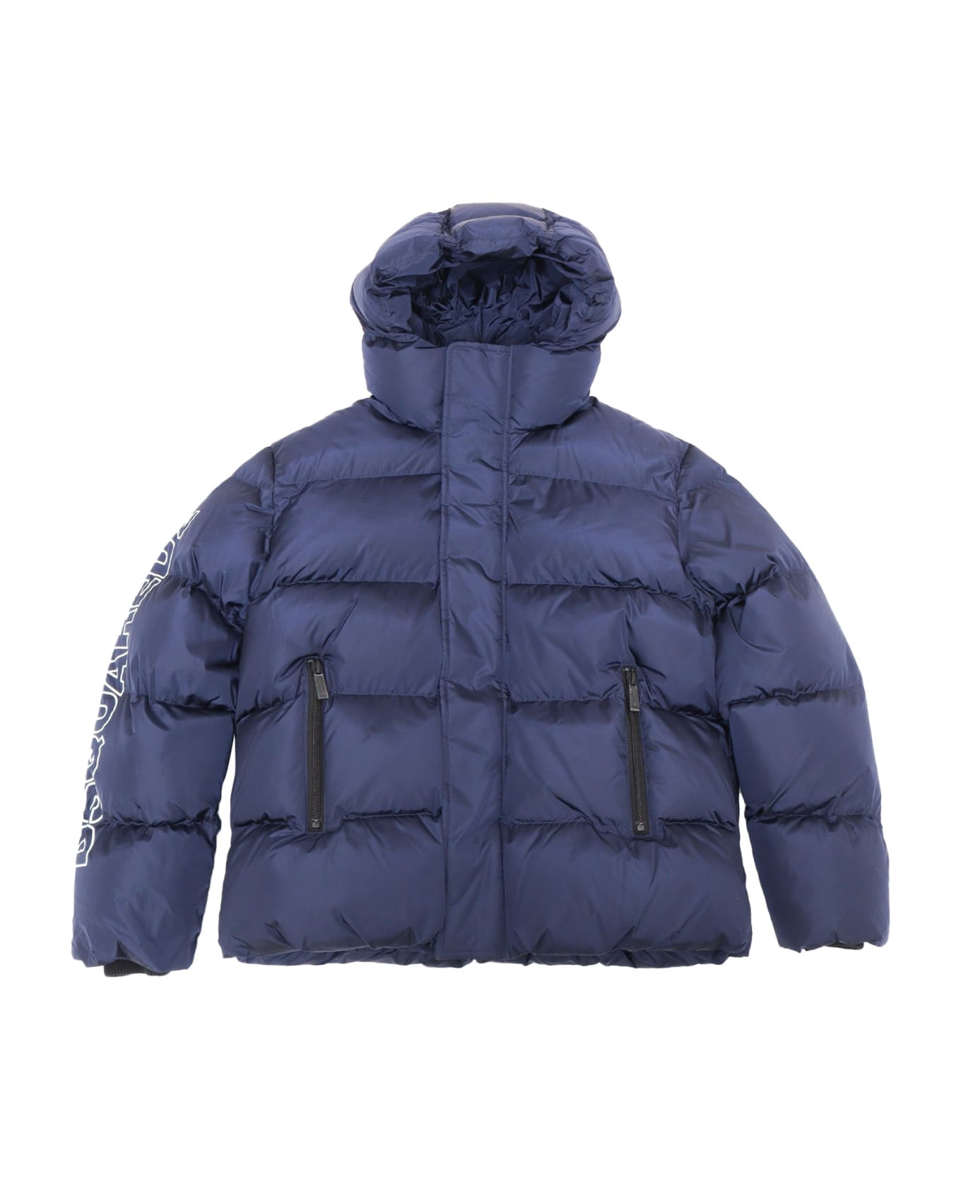 Padded and quilted jacket, hidden zip fastening, fixed hood, high collar, ribbed cuffs, straight hem, side zip pockets, contrasting logo print on the sleeve, regular fit