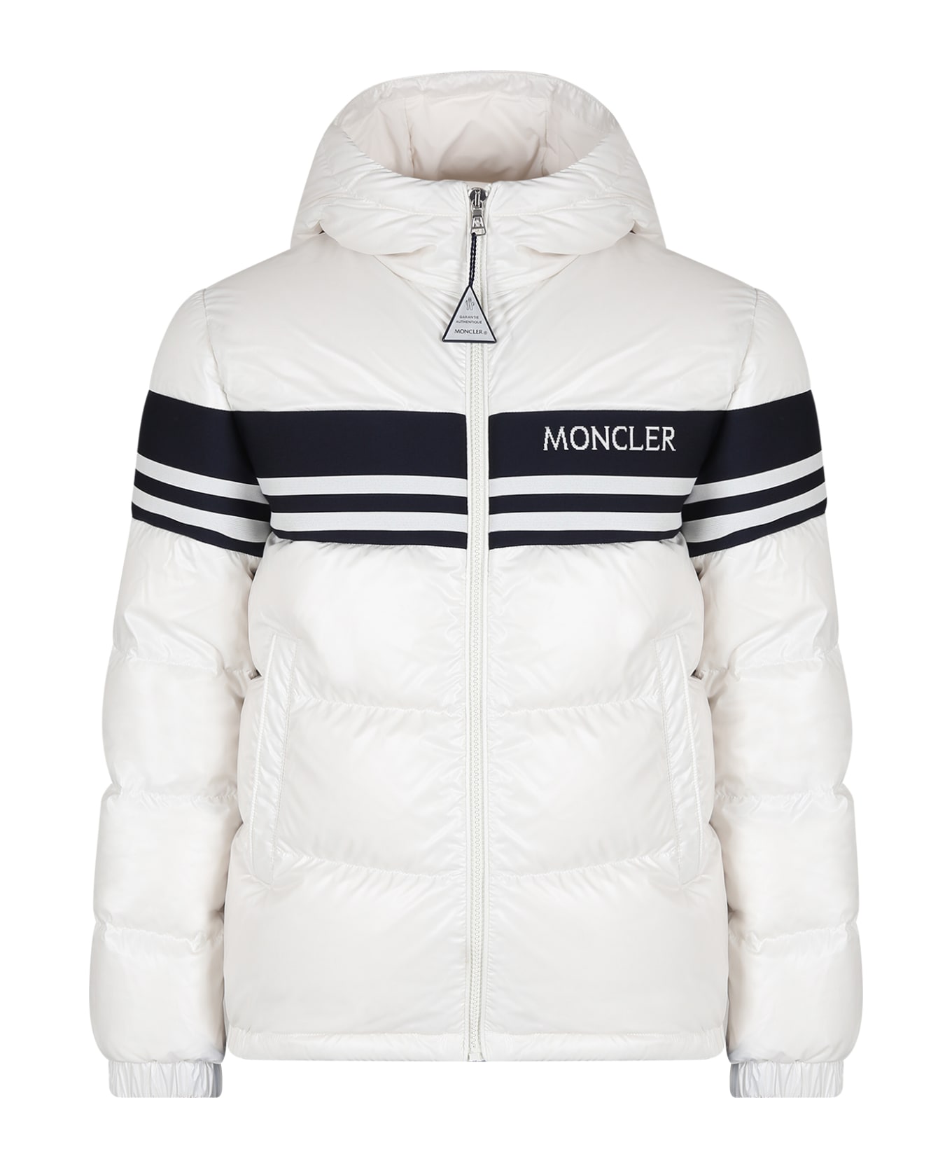 White down jacket, down-filled, with long sleeves, hood, front zip closure, welt pockets with snap button closure and elasticated cuffs and hem. It is embellished with Jacquard logo trim, logo patch on the sleeve.