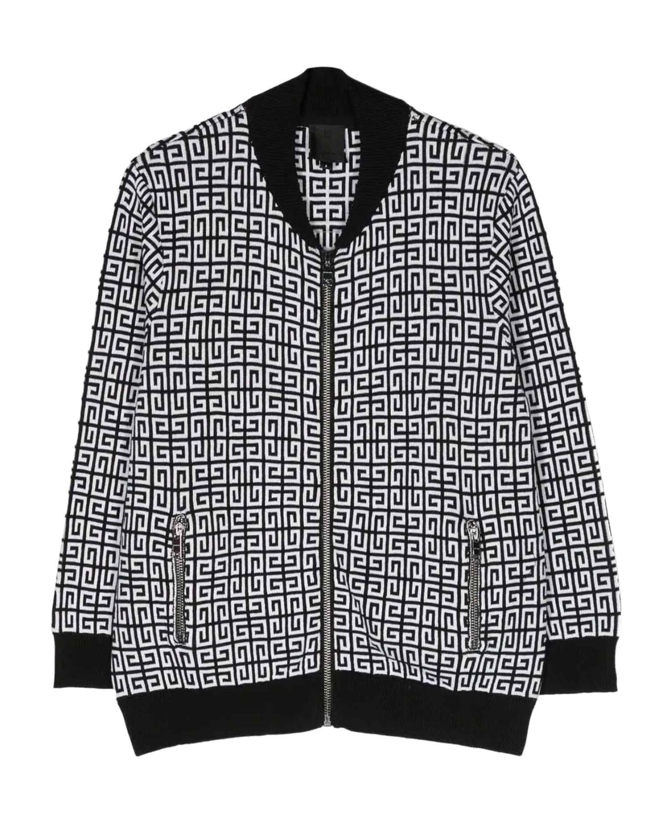 black/white cardigan boy. signature 4G pattern, jacquard pattern, embroidered logo at back, ribbed collar, front zip fastening, long sleeves, ribbed cuffs, two side zipped pockets, ribbed hem and unlined design. 100% Cotton
