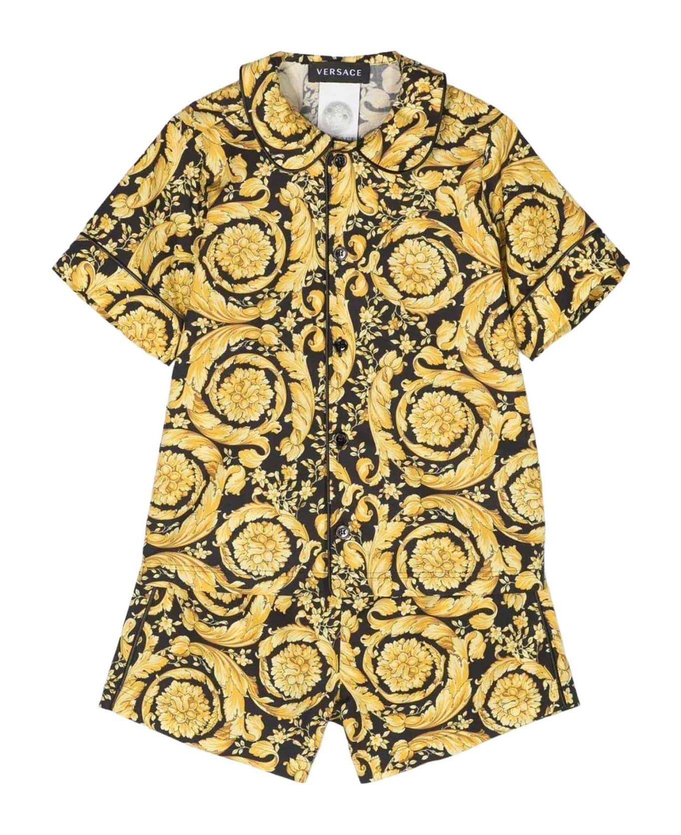 Black/gold unisex pajamas kids. Baroque print, short sleeves and elasticated waist. 100% Cotton