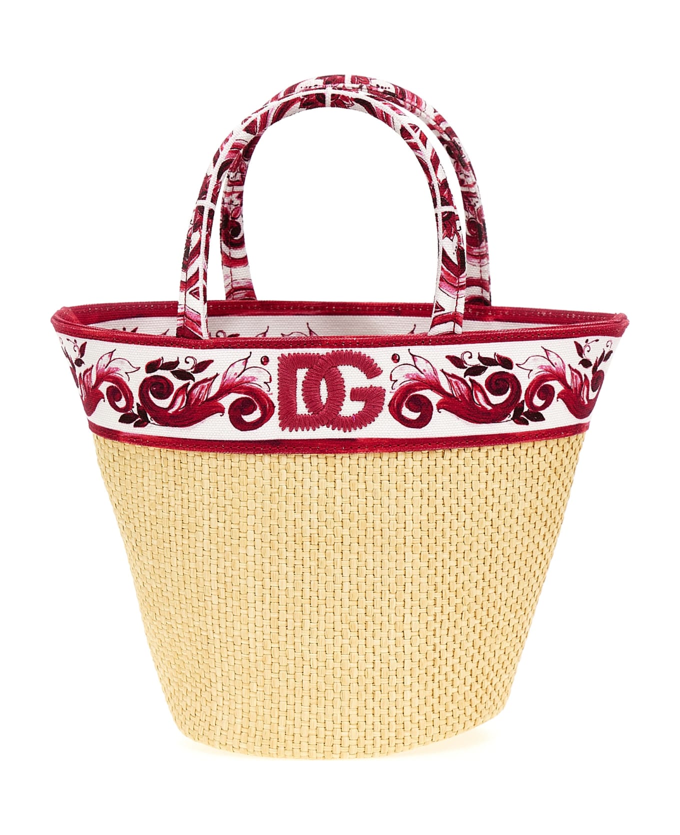 Straw handbag with Maiolica-print canvas details, magnetic closure, embroidered logo, and printed canvas lining. Composition: