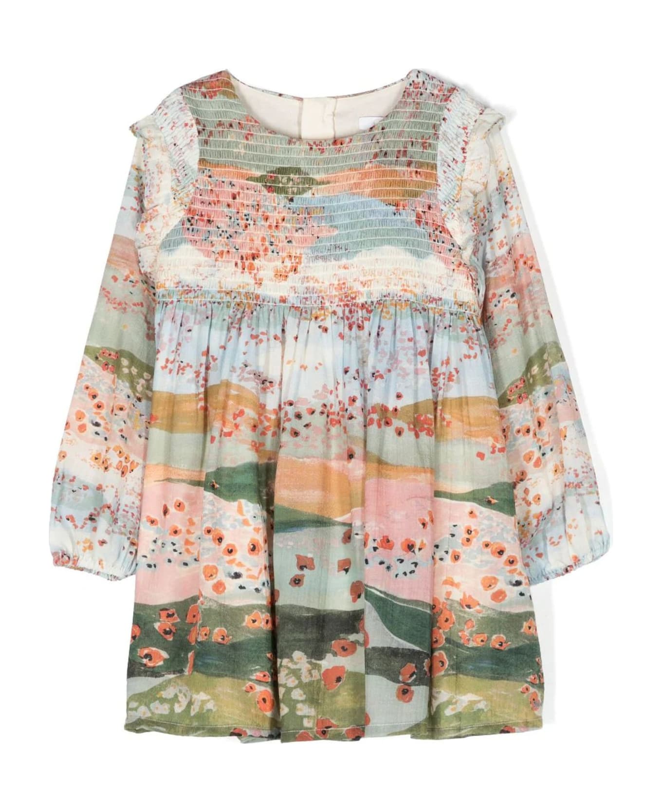 Multicolour wool dress, all-over graphic print, elasticated panelling, ruffled detailing, round neck, concealed rear zip fastening, long sleeves, elasticated cuffs, straight hem Composition: Wool, 100%